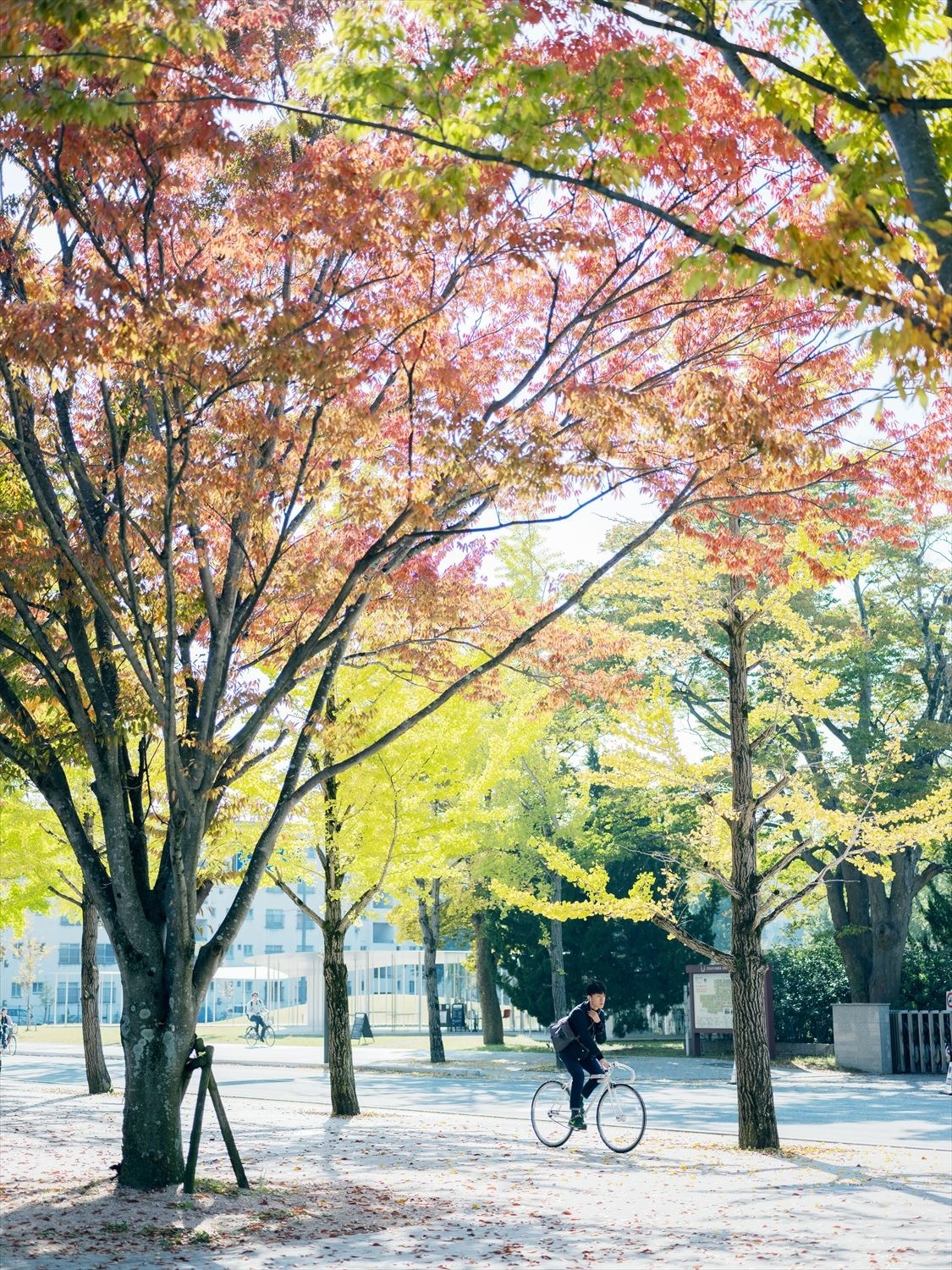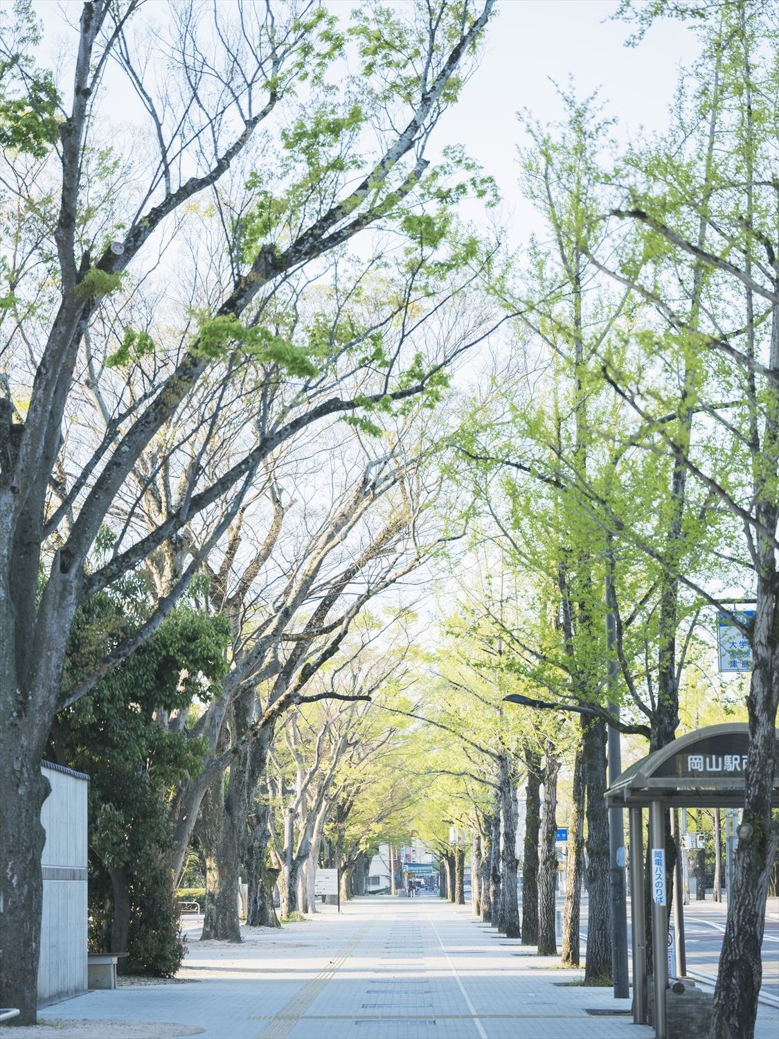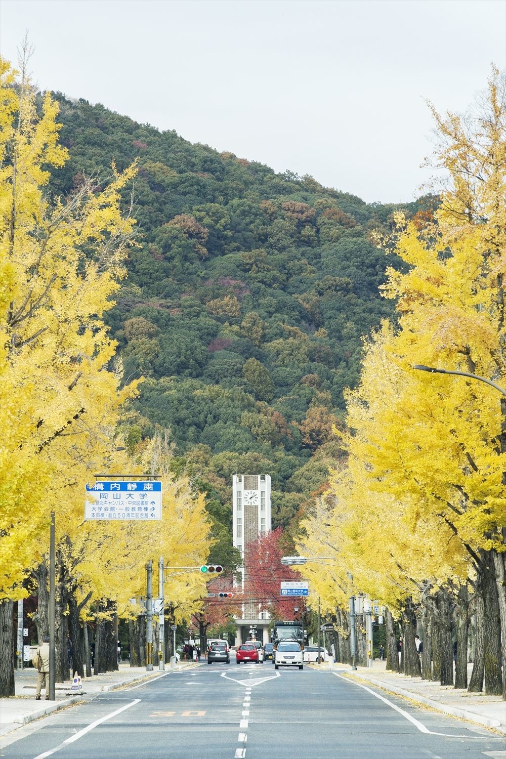 岡山大学は1949年に開学した国立総合大学で、その源流をたどると約150年の長い歴史があります。津島キャンパスはJR岡山駅から車で7分という市街地にありながら、約64万平方キロメートルもの広大な敷地を有し、四季折々で姿を変える美しいいちょう並木や大学のシンボルでもある時計台、世界的建築ユニットSANAAが手がけた建築物など、さまざまな景色が楽しめます。また、かつて陸軍が使用していた建物が今もなお現存しており、当時の様子を伝えています。