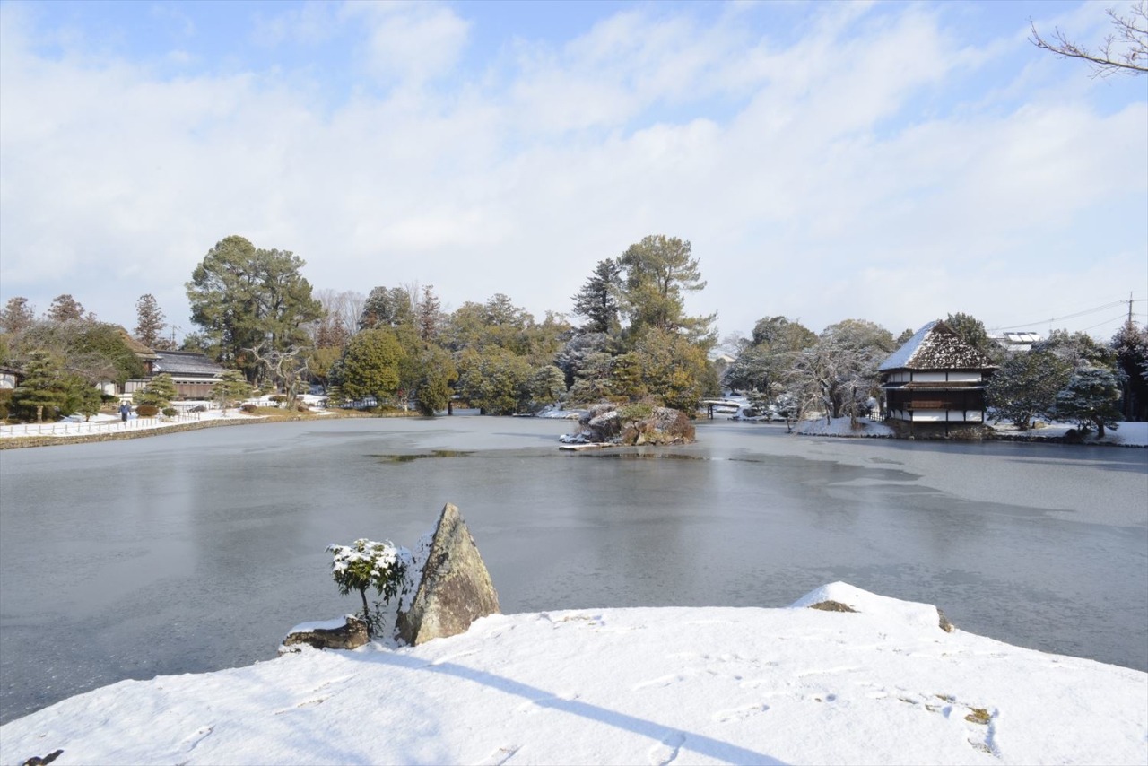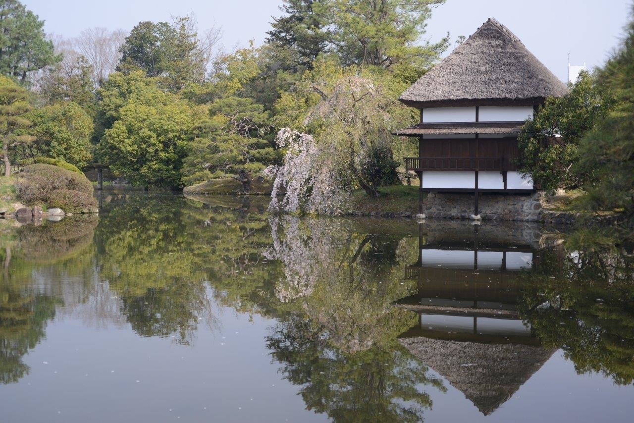 岡山後楽園よりも50年ほど古く、京都から小堀遠州流の技術者を招き、仙洞御所を模して造られたので、島の配置や植え込みなどにも京風の風雅な趣がある。