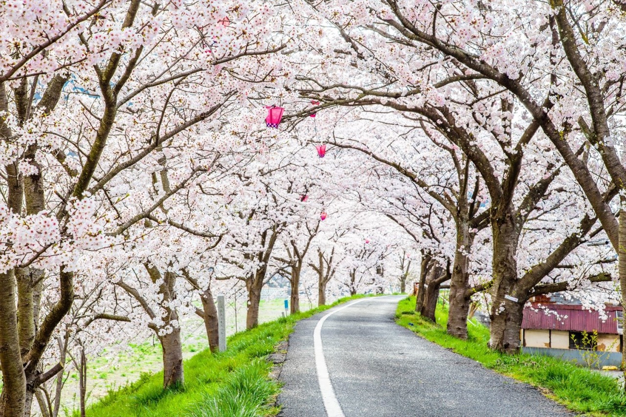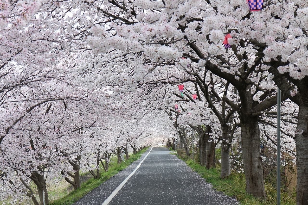 全長2km、約800本のソメイヨシノの桜並木が続く井原堤。見ごろは3月下旬から4月上旬で、この期間に開催される桜まつりではボンボリが点灯されるため夜桜も見ごたえあり。