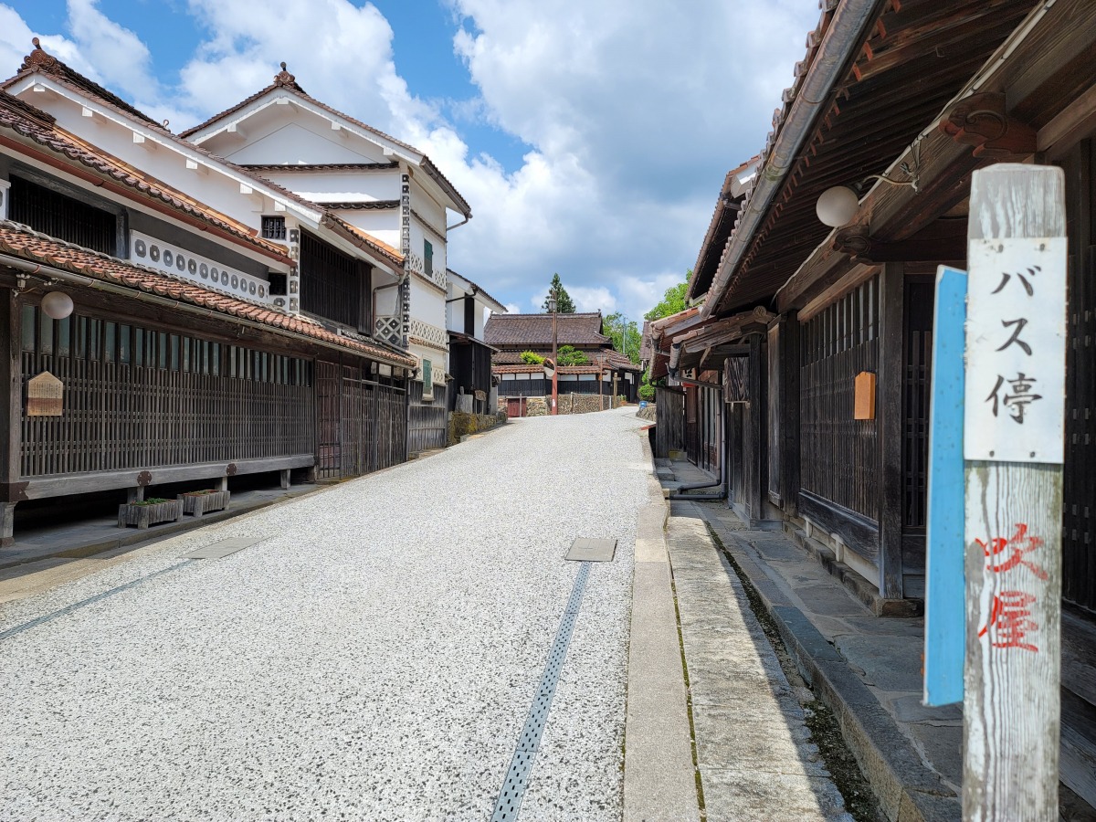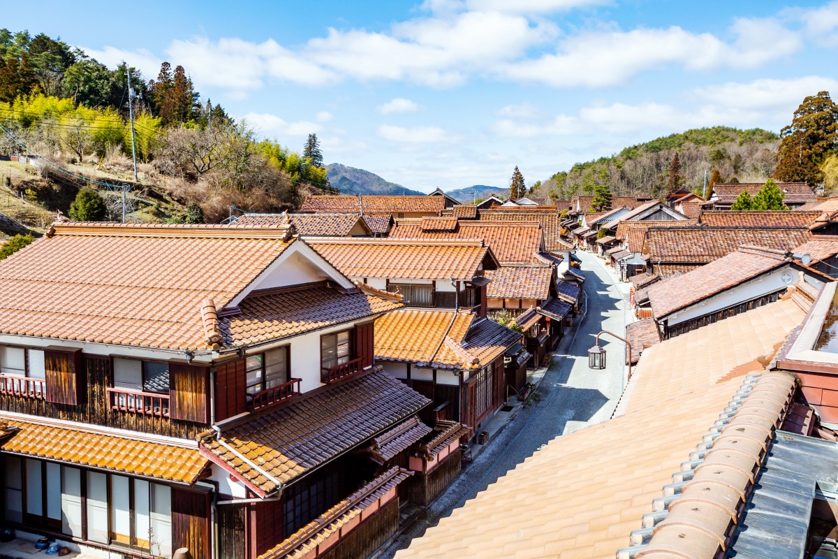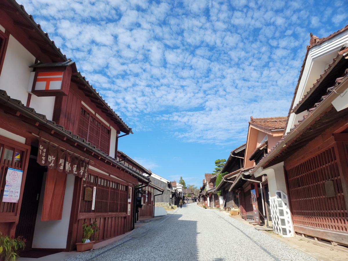 赤銅色の石州瓦とベンガラ色の外観で統一された、見事な町並み。