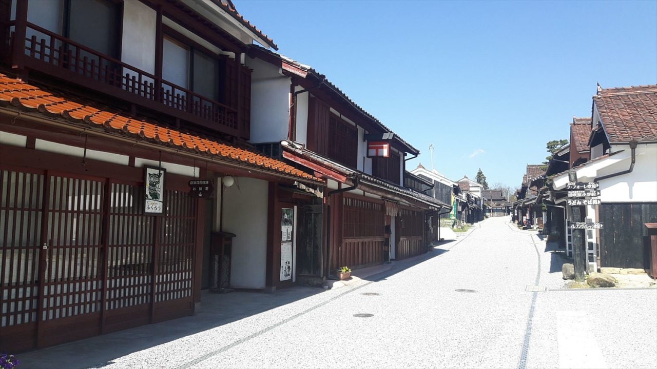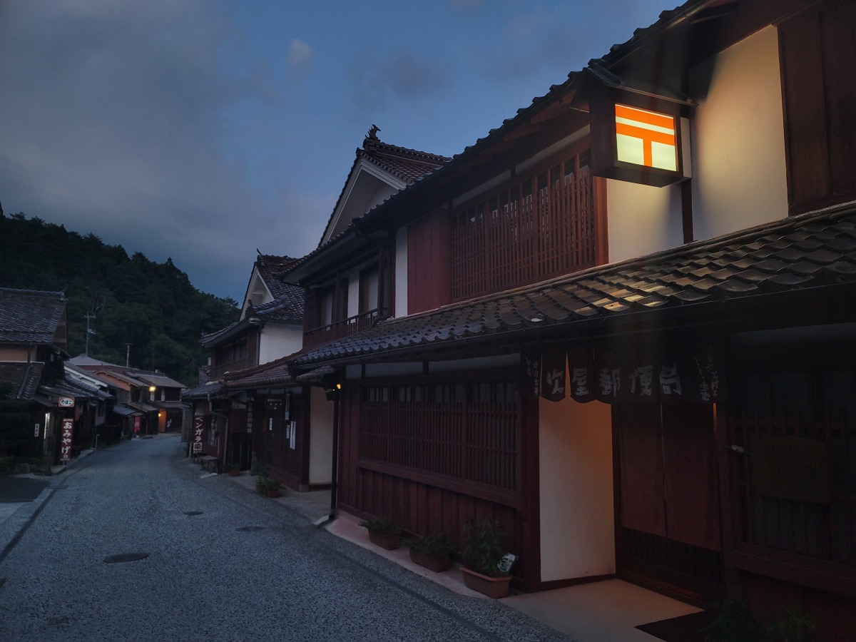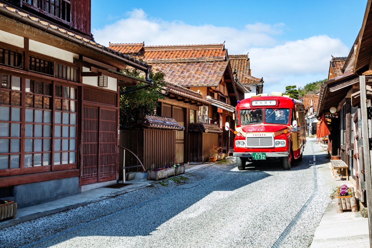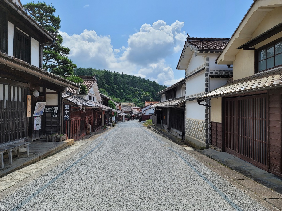 赤銅色の石州瓦とベンガラ色の外観で統一された、見事な町並み。
