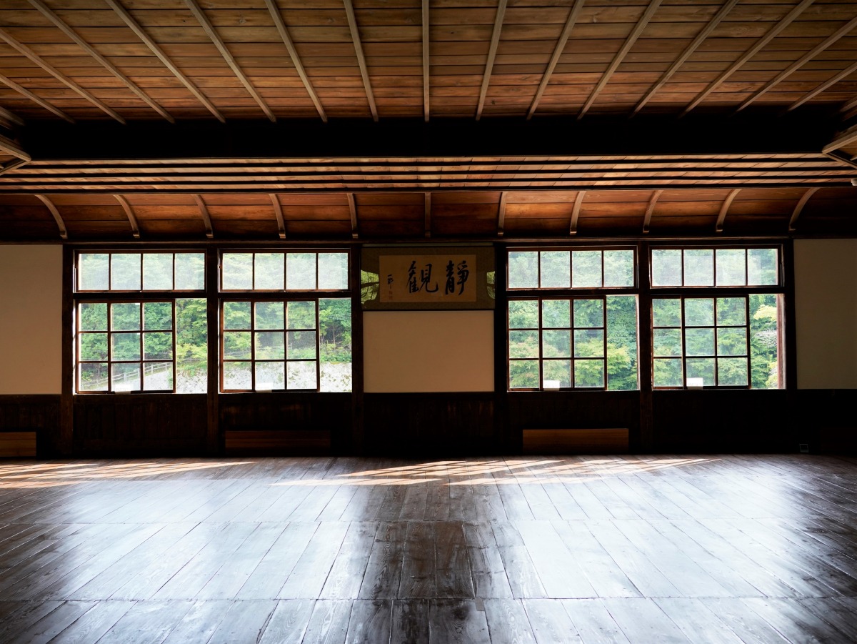 本館2階講堂内部の折上天井及び正面演壇や、天井を支えるトラス構造等は当時の建築手法を伝える。