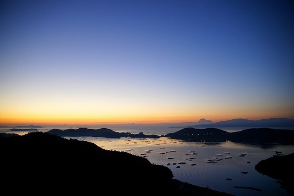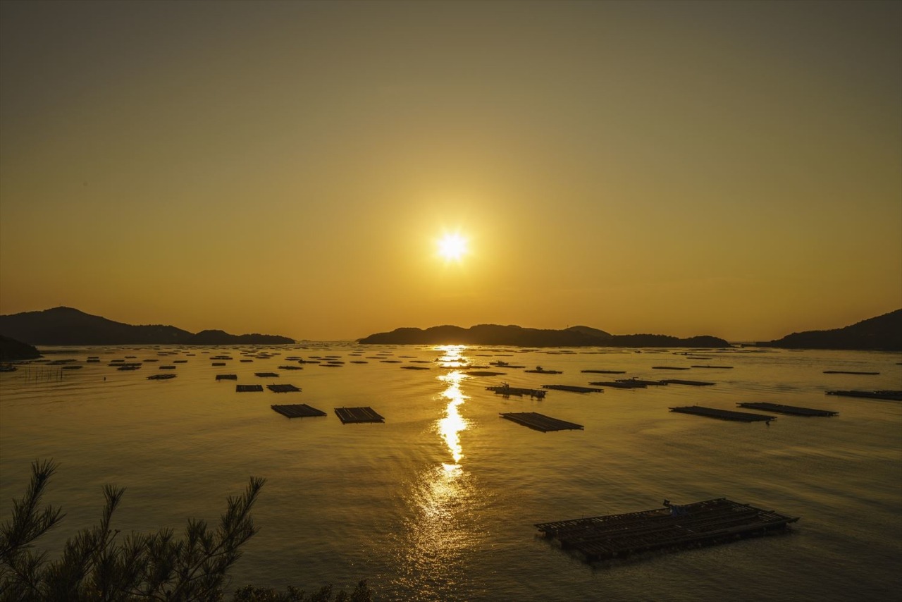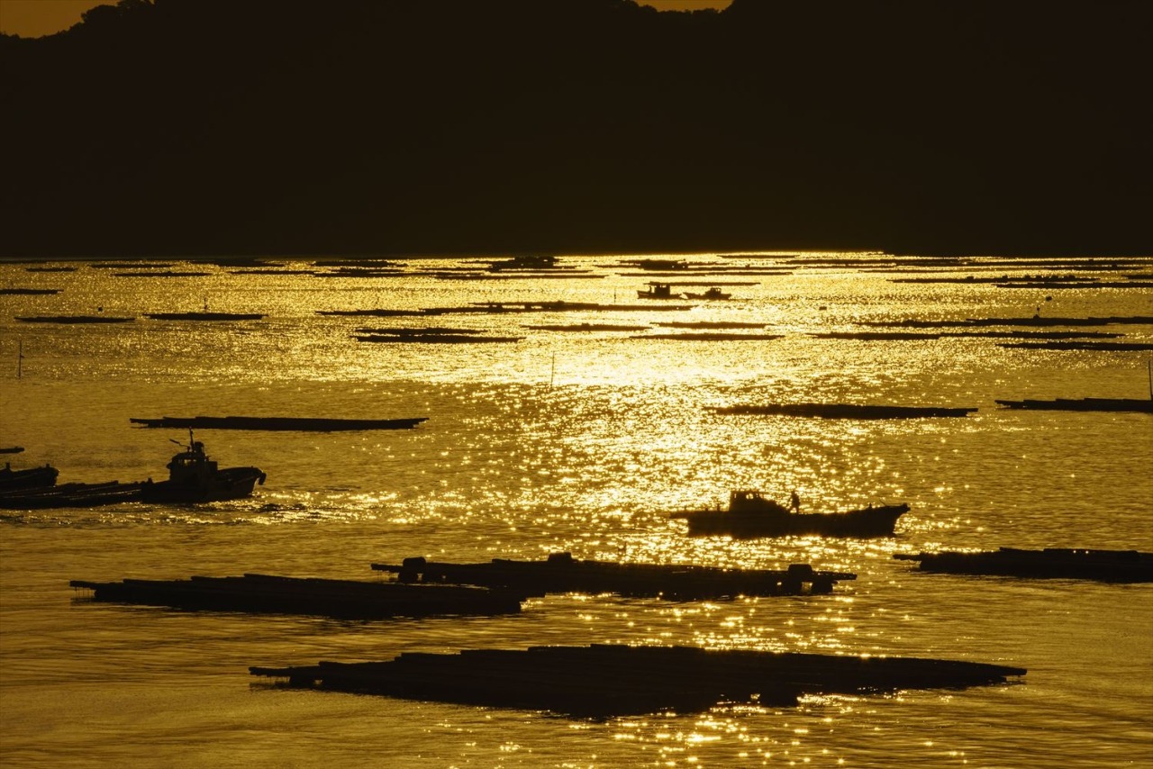 現在も牡蠣筏が浮かぶ景色が手前にあり、その向こうの海面、島から昇る朝日が美しく、写真愛好者から人気。