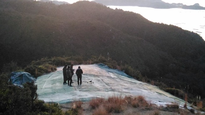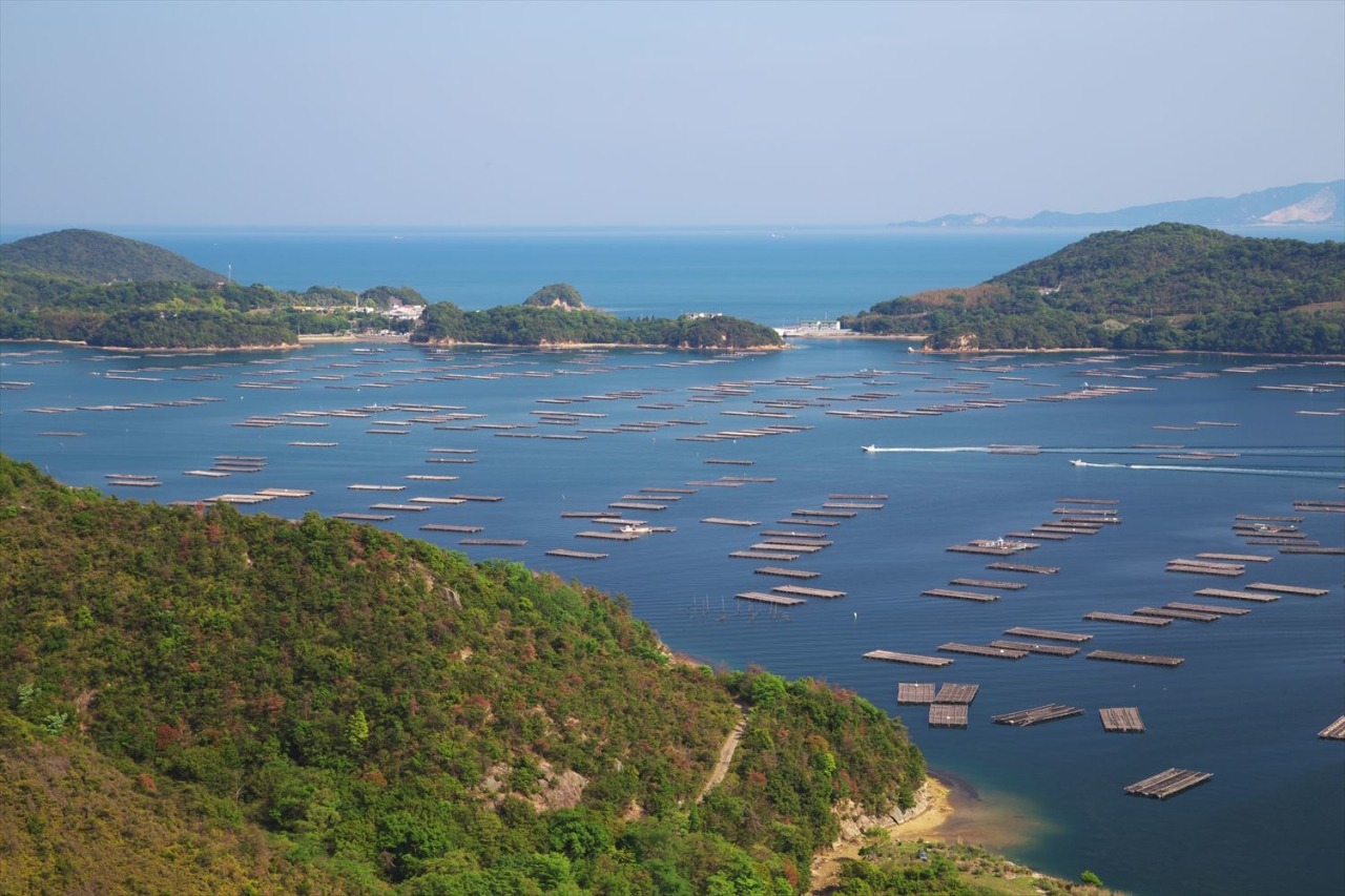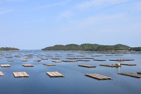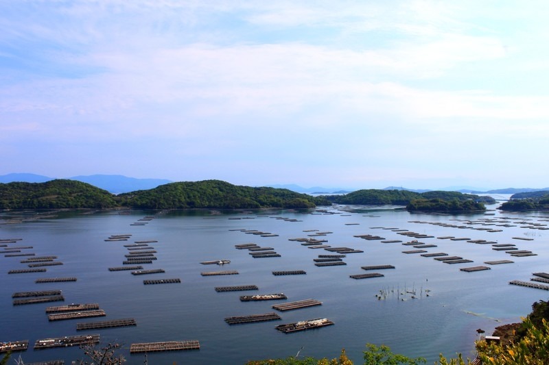 日中も青い空と牡蠣筏が浮かぶ海、島の景色が美しい。