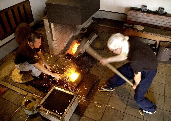 伝統技術を駆使して、玉鋼を鍛え、伸ばし、日本刀を作る。飛び散る火花や響き渡る鎚の音は迫力がある。