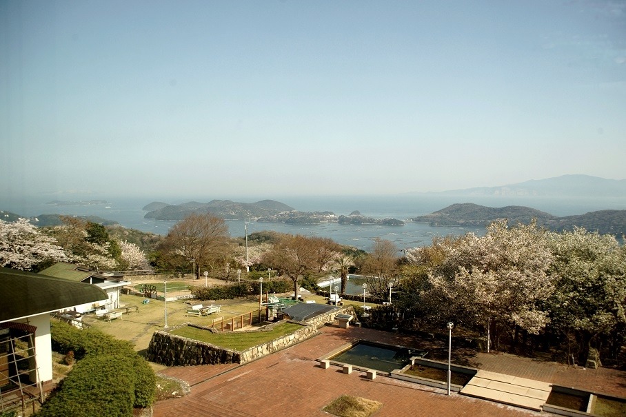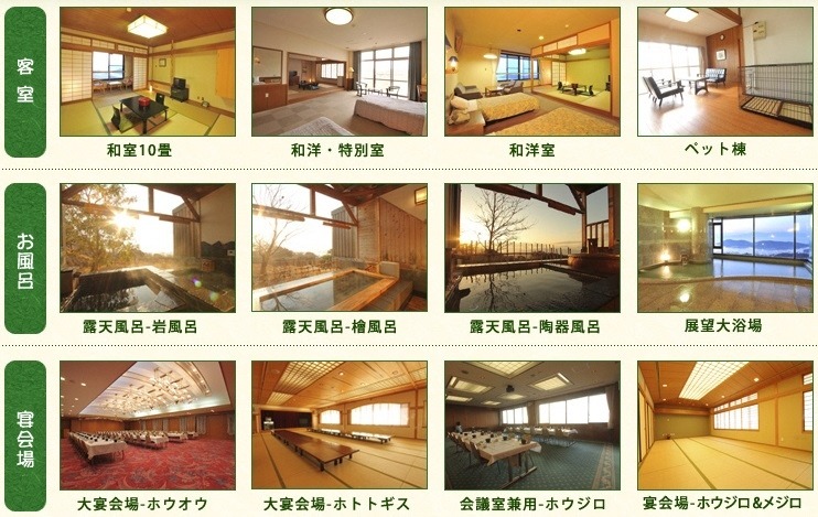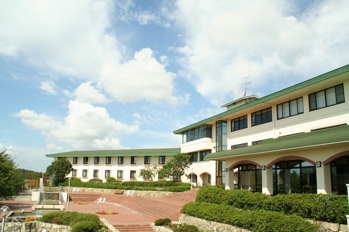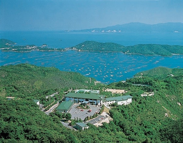 海を見下ろす山の上に建つ岡山いこいの村は、オーシャンビューの客室や展望露天風呂などを有する宿泊施設。