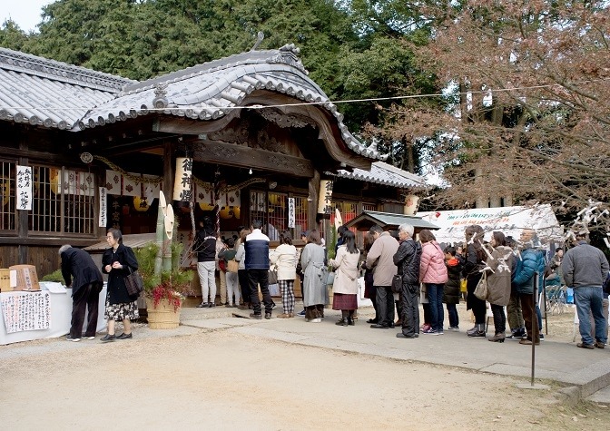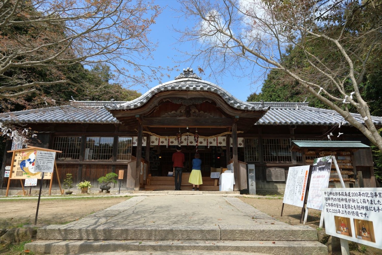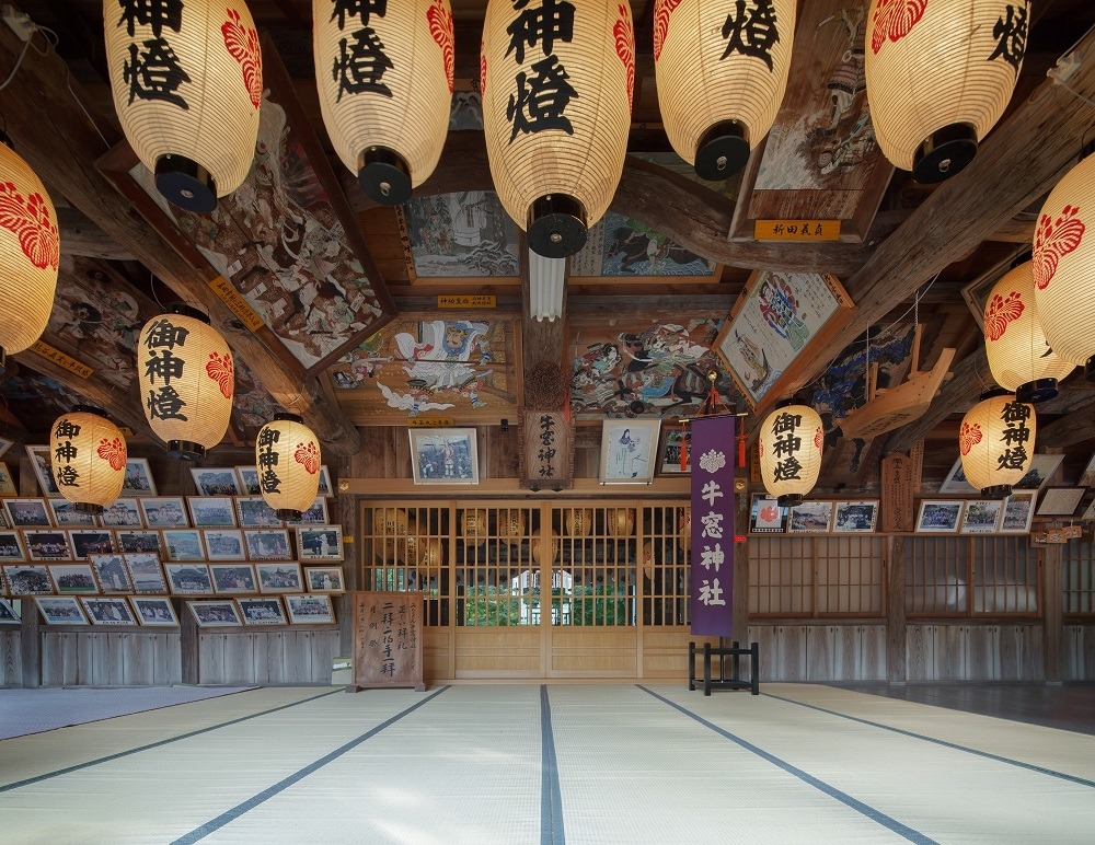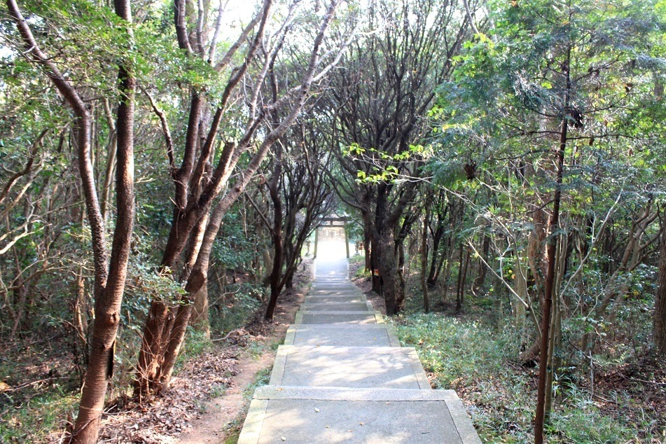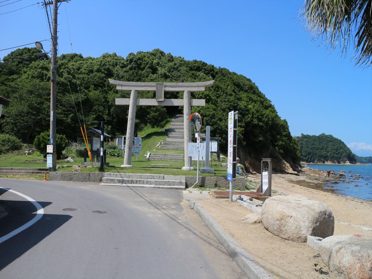 ウバメガシやヤマモモが繁る瀬戸内海の海岸にある原生林に囲まれた神社。中世以前から牛窓の鎮守としてあり、神社の神聖な空気感がある。