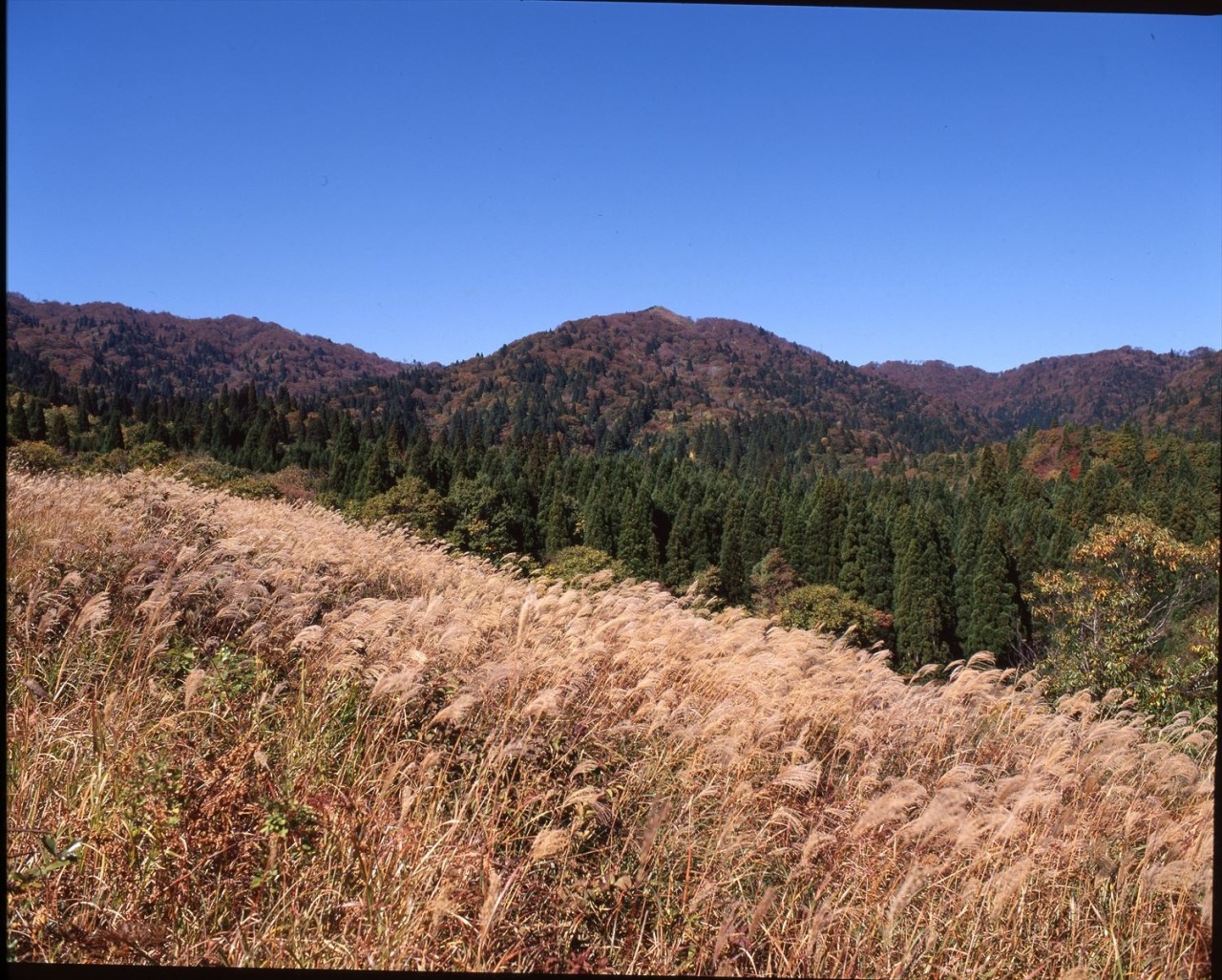 新庄村内の最高峰(1218m)。その名の通り山頂は高木がないため、霊峰・大山はもちろん、遠く鳥取県の弓ヶ浜まで見通すことができる。5月には白馬山との縦走路にカタクリの花が咲くことで有名。