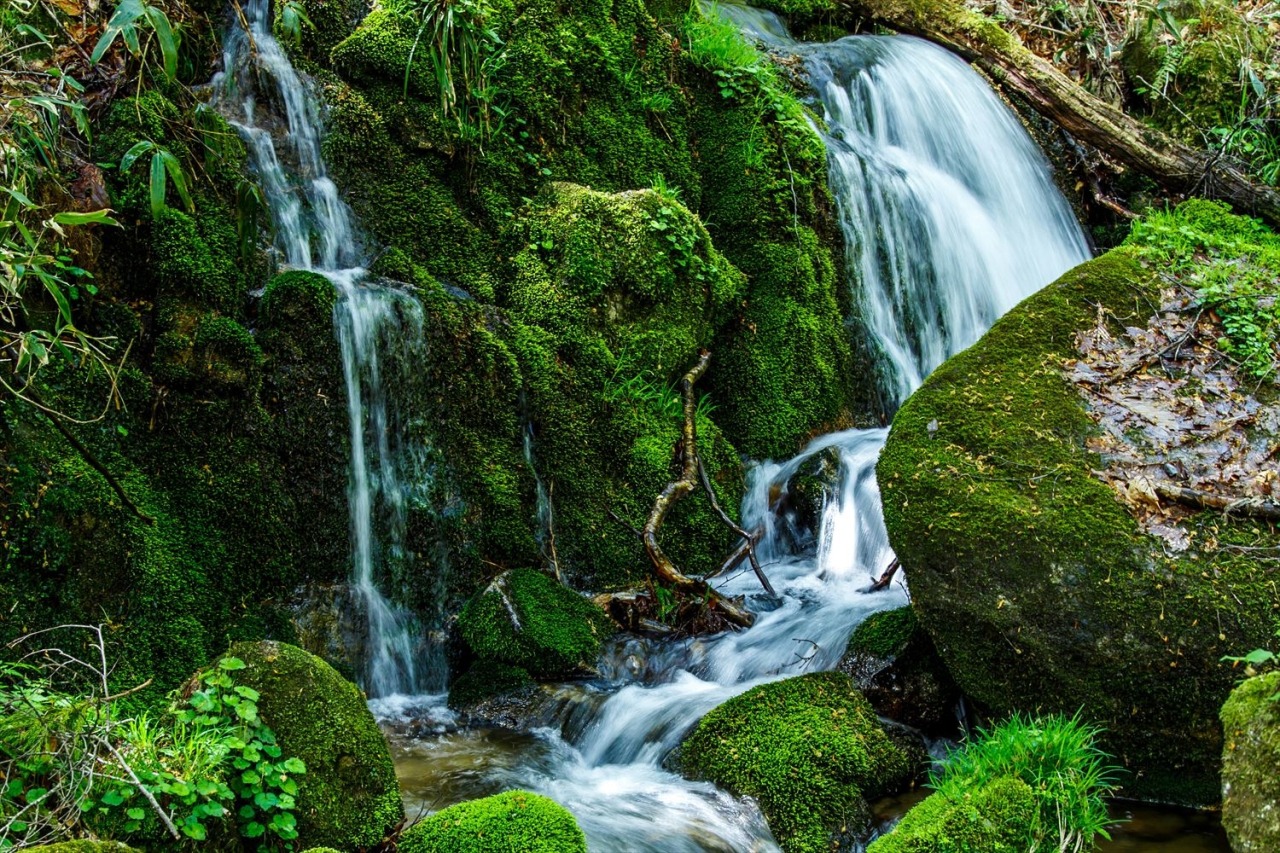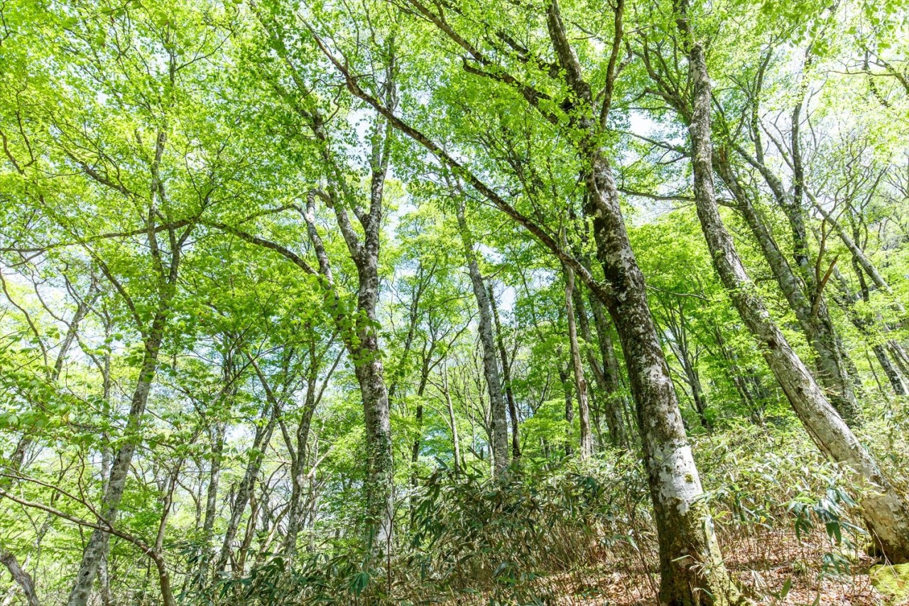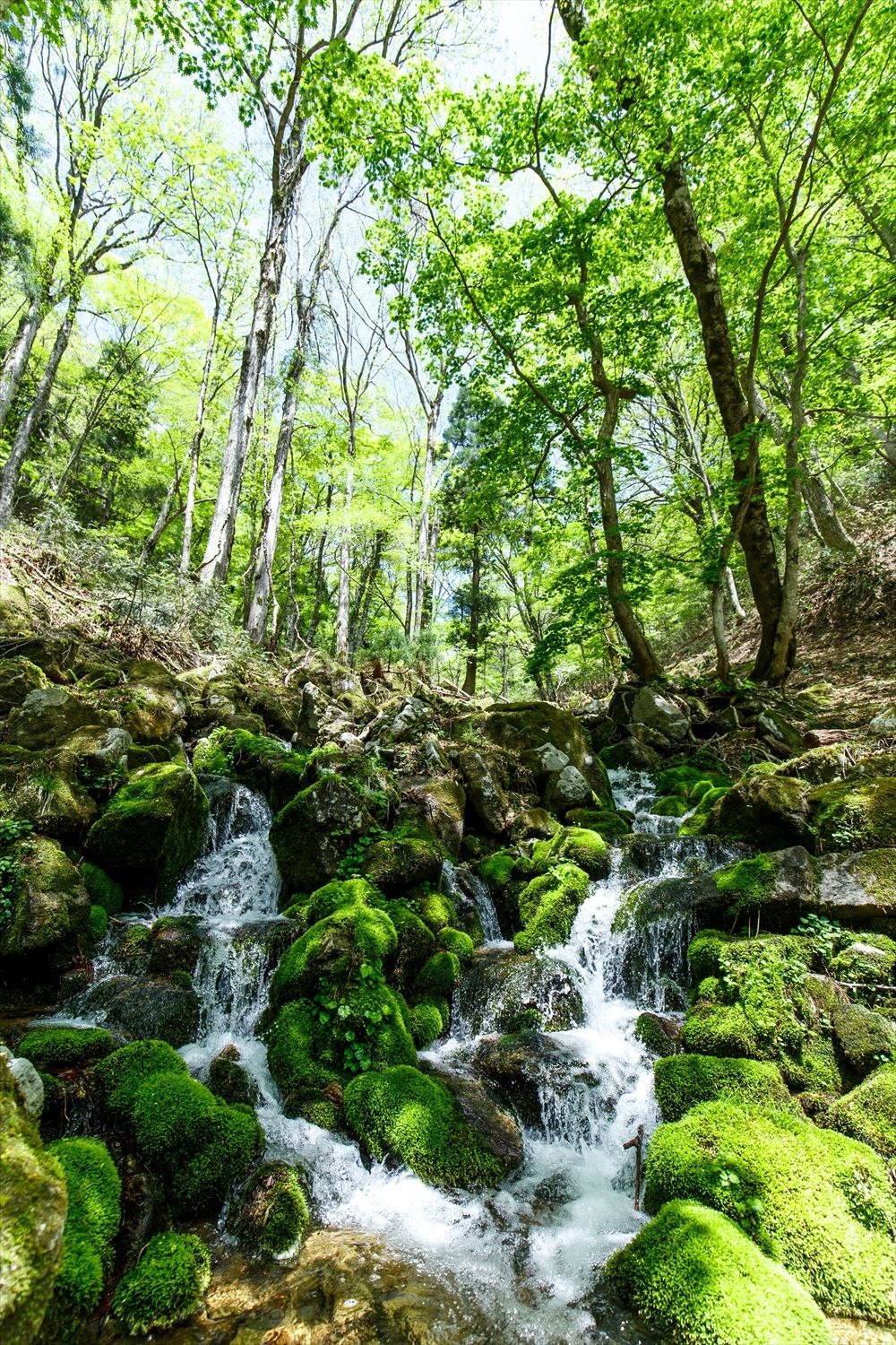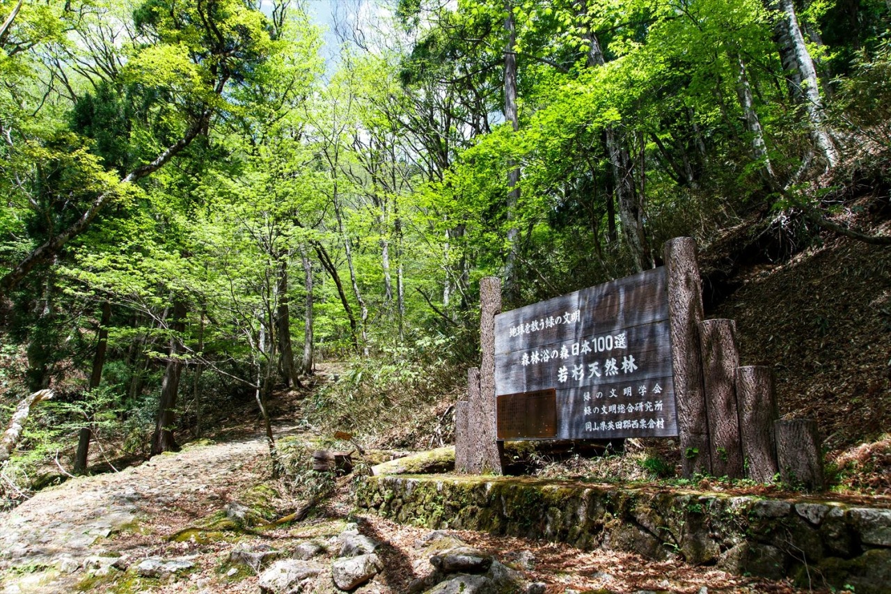 西粟倉村の最北端に位置する別名「若杉原生林」は83ヘクタールの面積に、ブナ、カエデ、ミズナラ、トチノキなどの巨木をはじめとした199種類の樹木が立ち並ぶ中国地方でも有数の天然樹林で、氷の山後山那岐山国定公園の特別保護地区に指定されています。県下3大河川のひとつ吉井川の支流の吉野川の源流であり、谷のせせらぎ、木々や揺れる音や、野鳥の虫の声が調和し、別世界を結成しています。