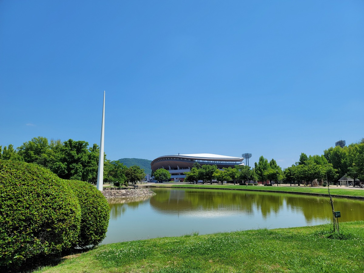 岡山市の中心部に位置し、約35haにおよぶ敷地内に、陸上競技場をはじめ体育館、野球場、テニスコート、武道館などの各種運動施設やピクニックや軽いスポーツの行える広場、散歩やジョギングが気持ちよくできる園路などが整備された憩の公園です。