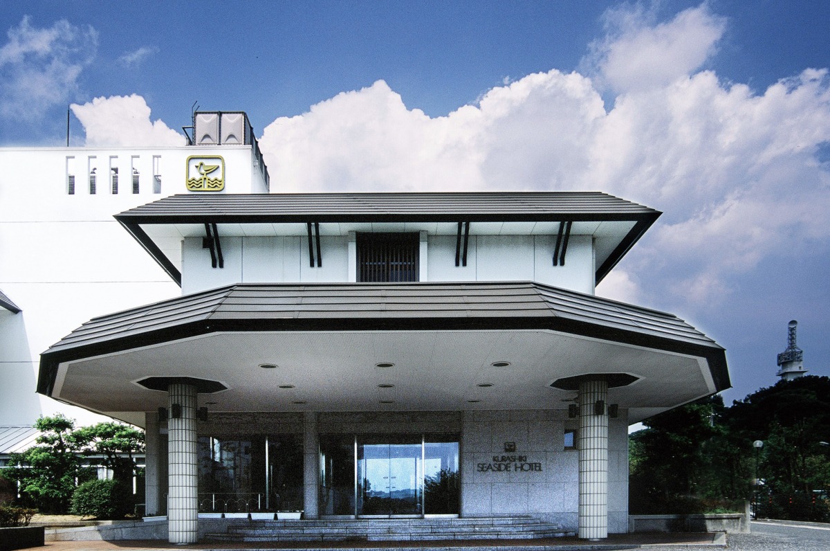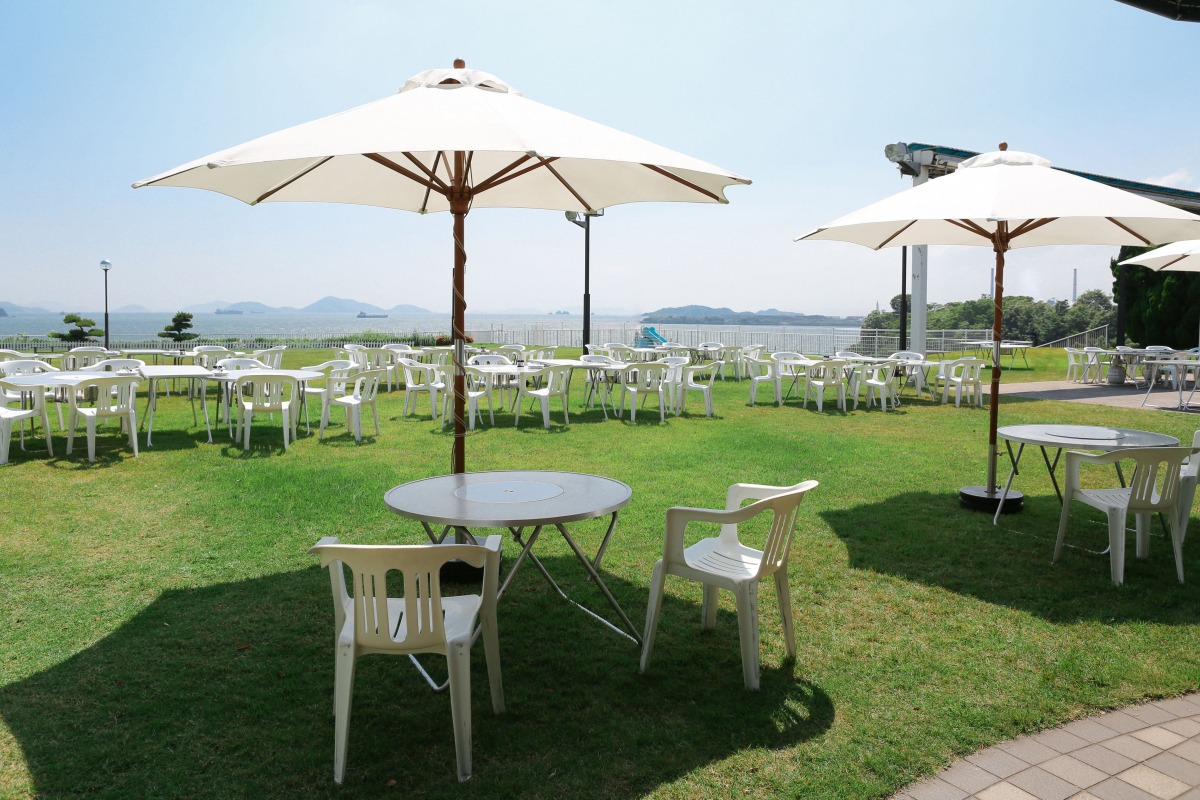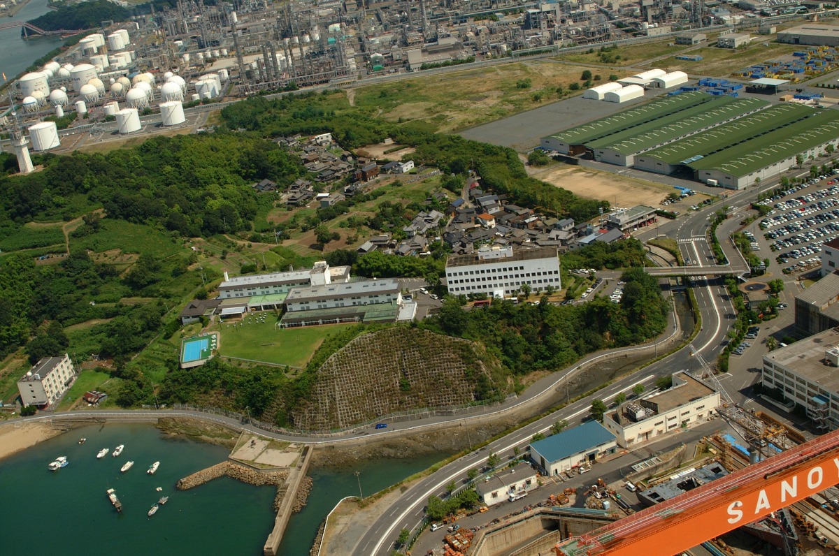 水島コンビナートの一角に有り、瀬戸内海水島灘を見下ろす、広い芝生庭園の向こう側には工業地帯が広がっています。