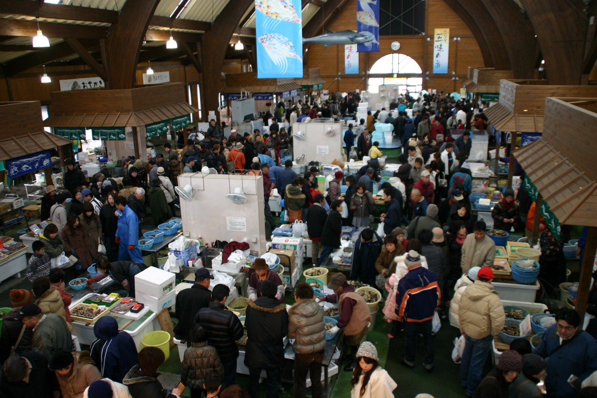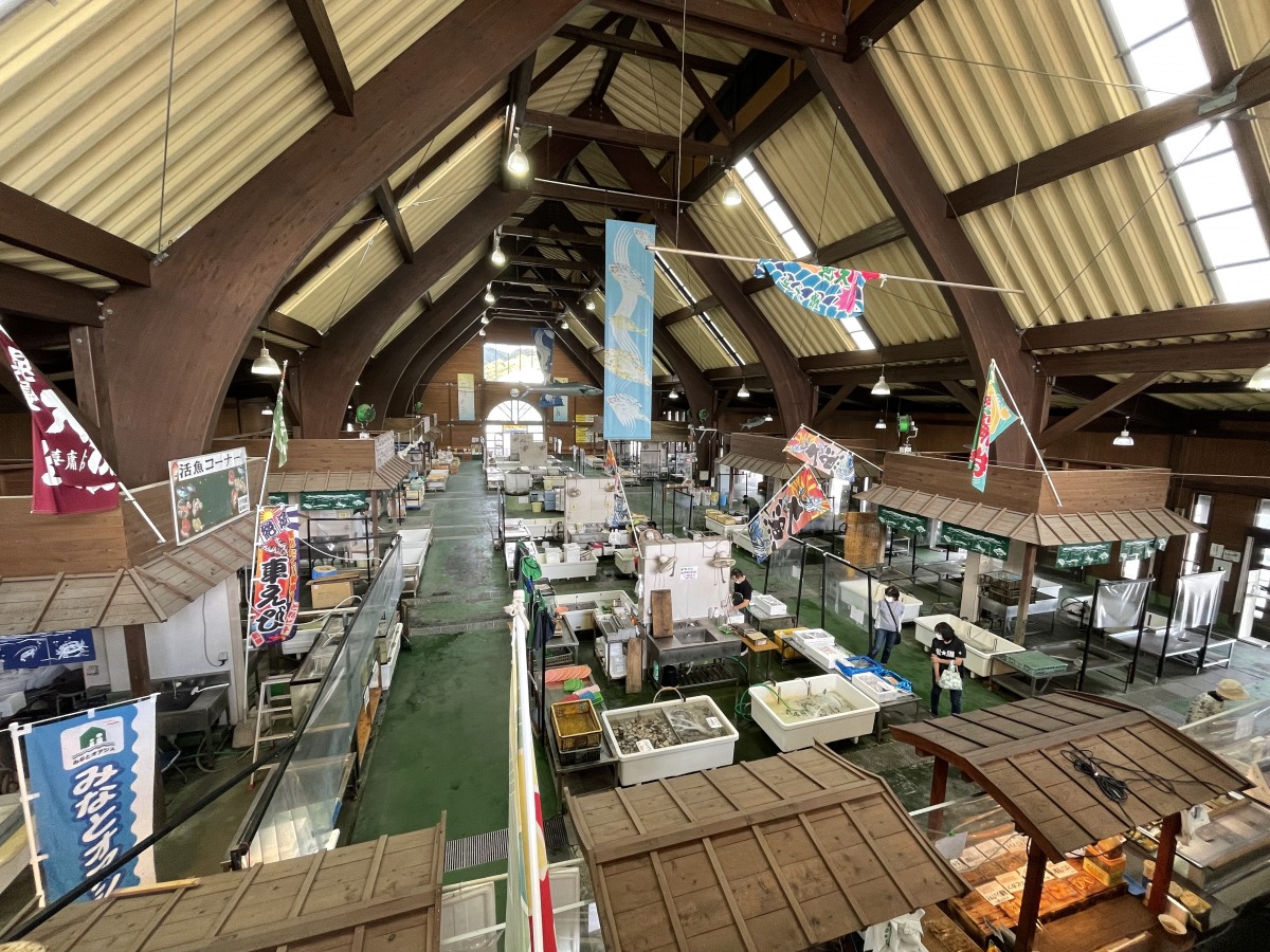 魚市場。となりで焼いて食べるスペースも。毎月第1日曜日には「ぎょぎょっと祭り」が開催。