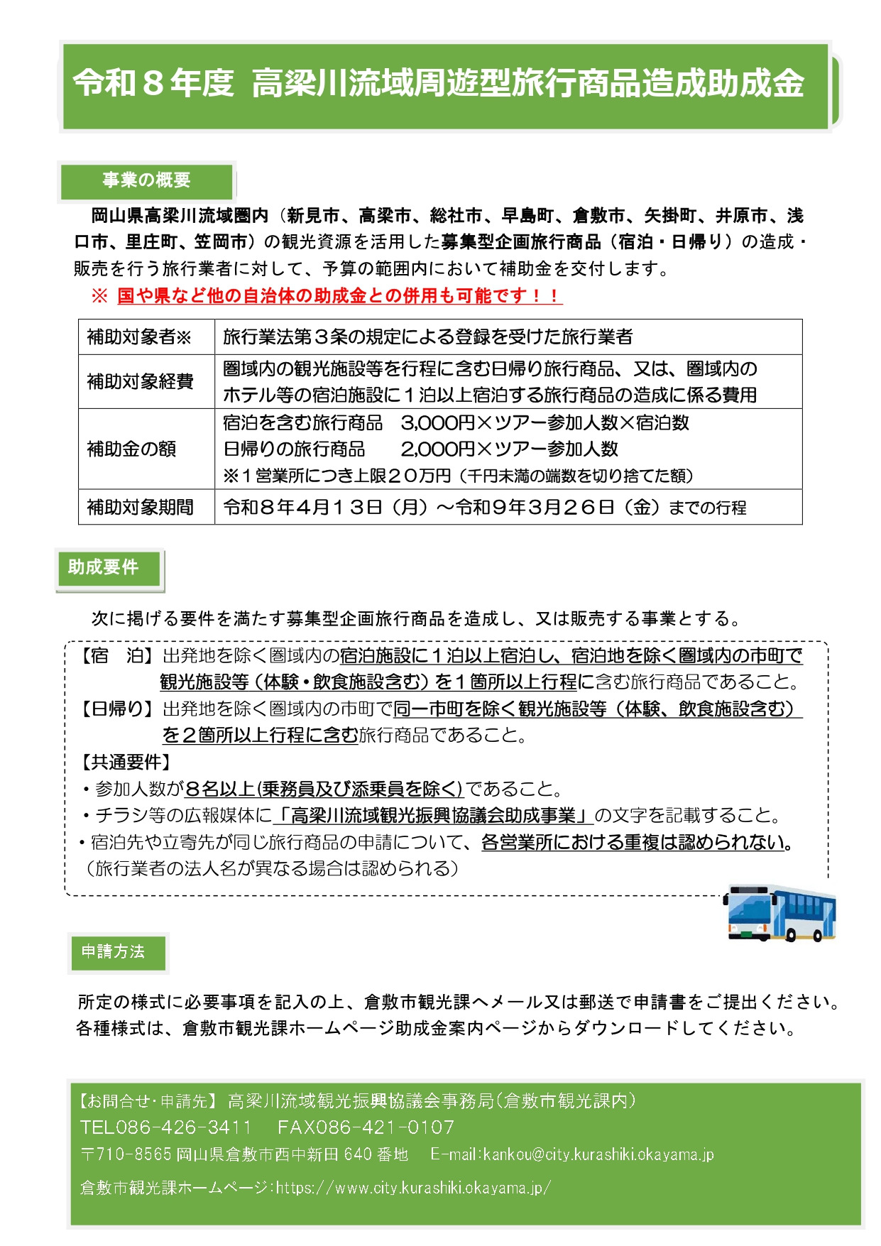 岡山県高梁川流域圏内(新見市・高梁市・総社市・早島町・倉敷市・矢掛町・井原市・浅口市・里庄町・笠岡市)の観光資源を活用した、募集型企画旅行商品の造成及び販売を行う旅行業者等に対して、予算の範囲内において助成金を交付します。