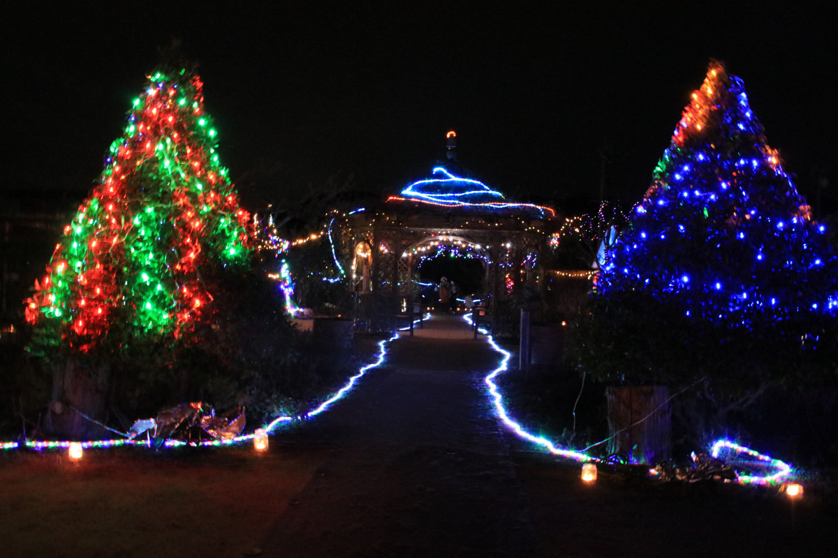 冬の「熊山英国庭園」は、クリスマスのイルミネーションで輝きます。木々や入口のアーチ、ガゼボ、ホールの壁が色とりどりの光に照らされて、幻想的な空間を演出します。昼間は四季折々の草花があたたかく迎えてくれる庭園の、普段と一味違った光の祭典をお楽しみください。イルミネーションは、2025年12/18(木)~12/29(月)の予定で開催。