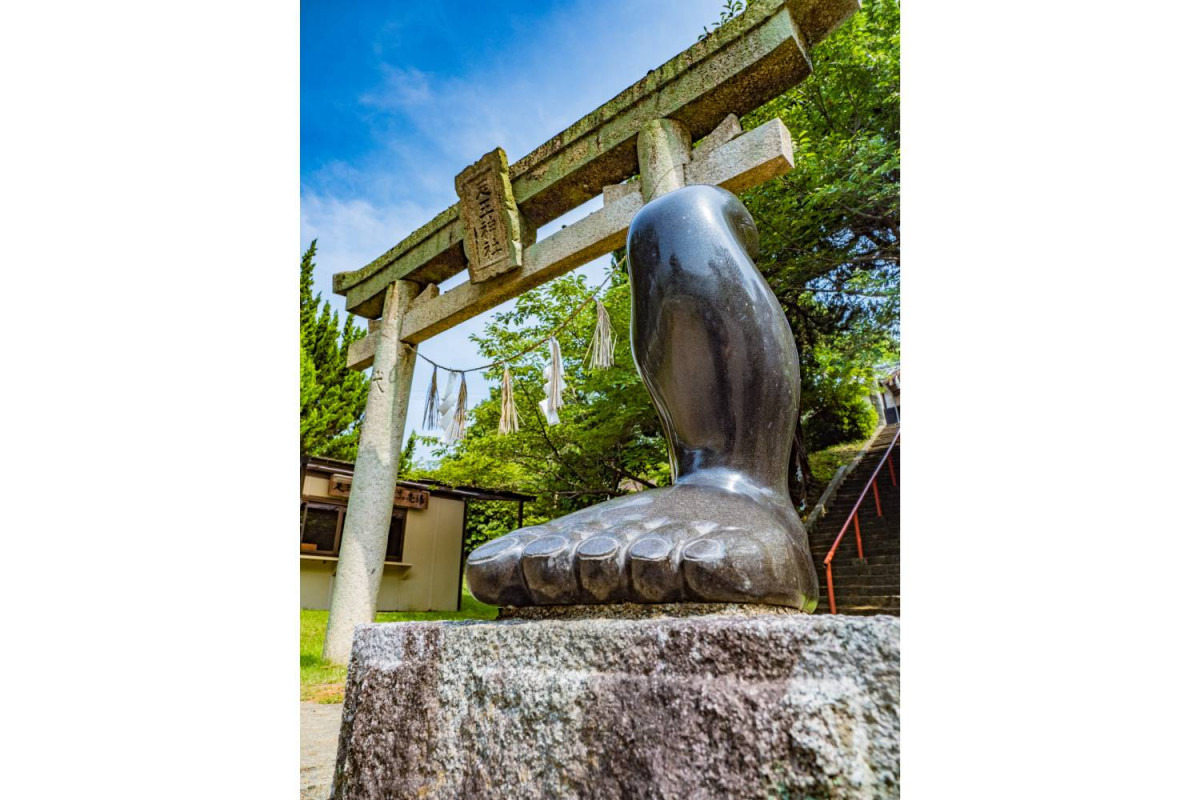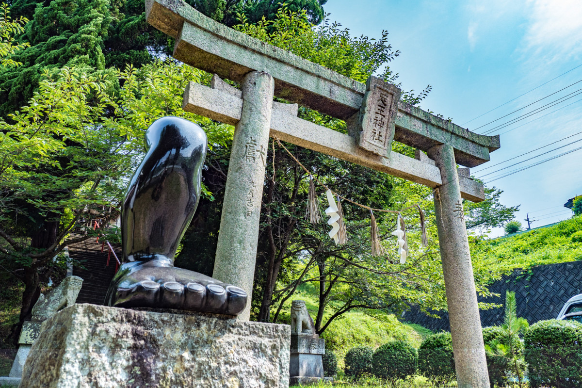 狛犬の代わりに一対の黒光りする足の像が置かれている神社です。「足の王」という立派な名前のとおり、足の怪我や病気などの足にまつわることに御利益があるといわれています。足の神様を祀っているのは全国的にも珍しく、地元の人からは「足王さま」と呼ばれています。