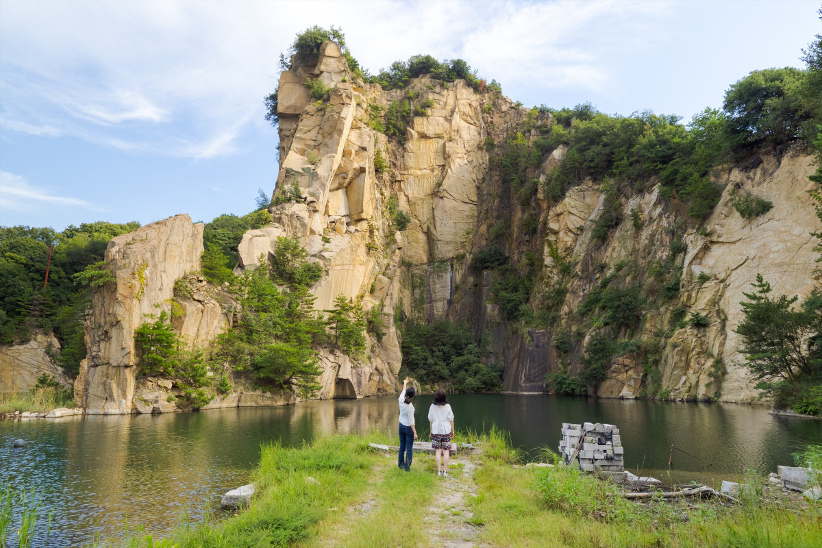 石の採掘で栄えた笠岡諸島最大の島で、お笑い芸人「千鳥」大悟さんの出身地。2019年に「知ってる!? 悠久の時が流れる石の島~海を越え、日本の礎を築いた せとうち備讃諸島~」として、日本遺産に認定されました。北木御影石(きたぎみかげいし)は、江戸時代に改修が行われた大坂城の石垣をはじめ、旧日本銀行本店、三越本店、靖国神社の大鳥居など、有名な構築物に使用されており、現在も稼働している採石場では、高さ60mの「石切りの渓谷展望台」からの見学ができます。豊浦港近くにある「K’s LABO(ケーズ ラボ)」では、自転車やレジャーグッズのレンタルも可。石を使った体験コーナーや雑貨ショップのほか、カフェとしても利用OKです。
