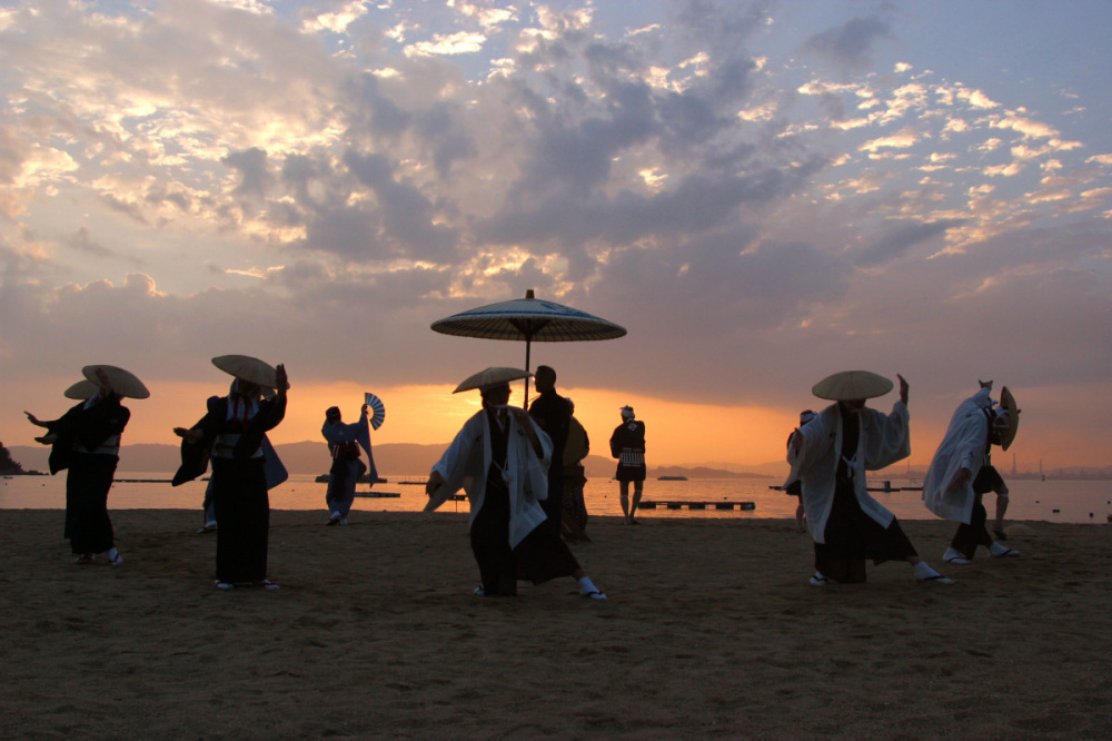 白石島に伝承される盆踊りの一種「白石踊」は、源平合戦の両軍の戦死者の霊を慰めるために始められたものといわれており、毎年新暦の8月13日~16日の夜に島の浜辺で踊られています。ひとつの音頭に合わせて、男踊、女踊など十種類以上の踊りがあるのが特徴で、他に類を見ない形式です。2022年11月30日、民俗芸能「風流踊(ふりゅうおどり)」としてユネスコ無形文化遺産への登録が正式決定しました。