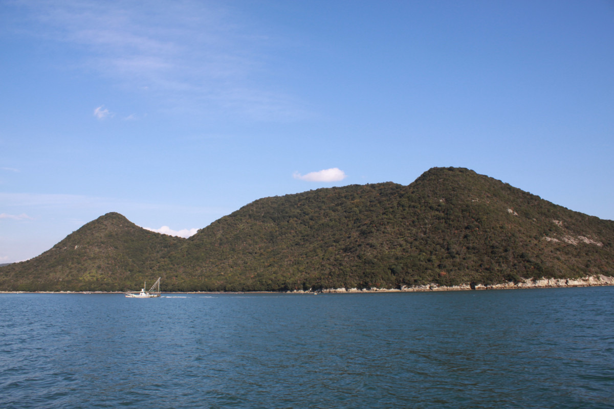 笠岡沖に点在する30余りの島々の中央にあり、笠岡諸島の景観の中心。花崗岩の地肌が遠くから白い雪をかぶったように見えることが島名の由来と言われています。ハイキングコースが整備されており、海を望む美しい景色と奇岩を眺めながら歩けます。鬼ヶ城と呼ばれる山の頂上近くにある鎧岩(国指定天然記念物)や、名前の通りまさに大きな玉のような巨石・大玉岩、弘法大師が唐から帰国する際に立ち寄ったと伝わる巨石に覆われた「弘法山開龍寺」など、興味深いスポットも点在。弘法山開龍寺の境内に建つ白い塔、日本初のタイ式仏舎利塔もお見逃しなく。