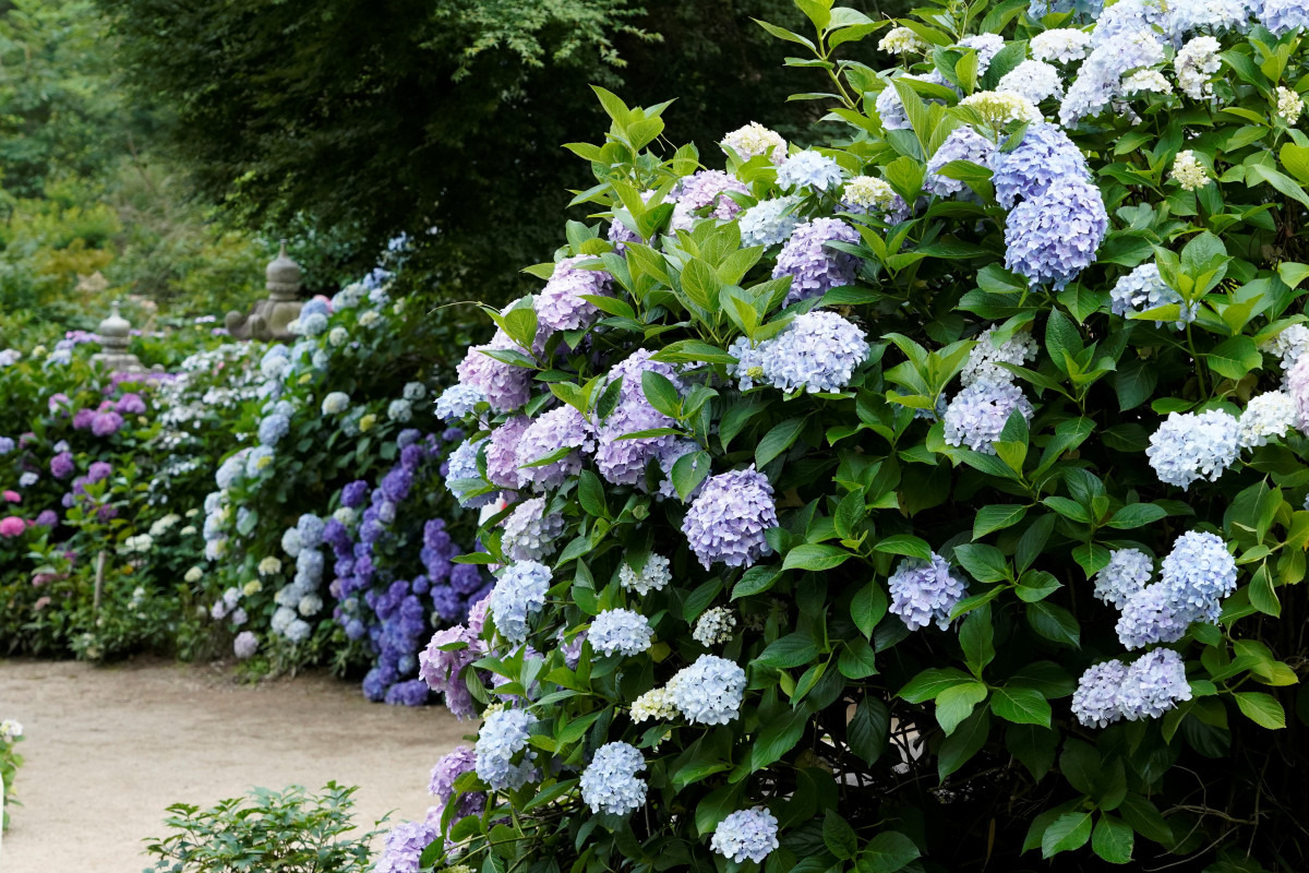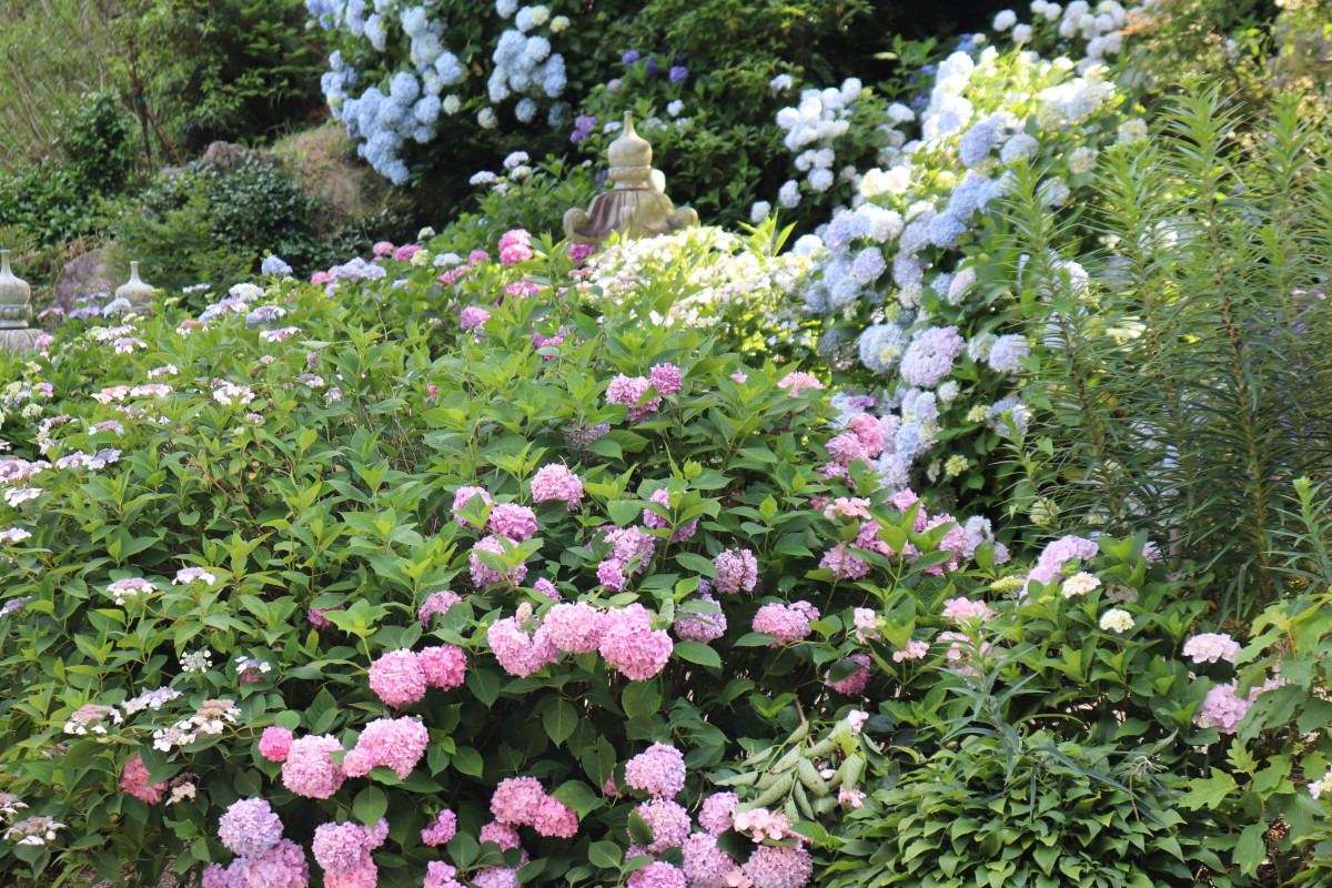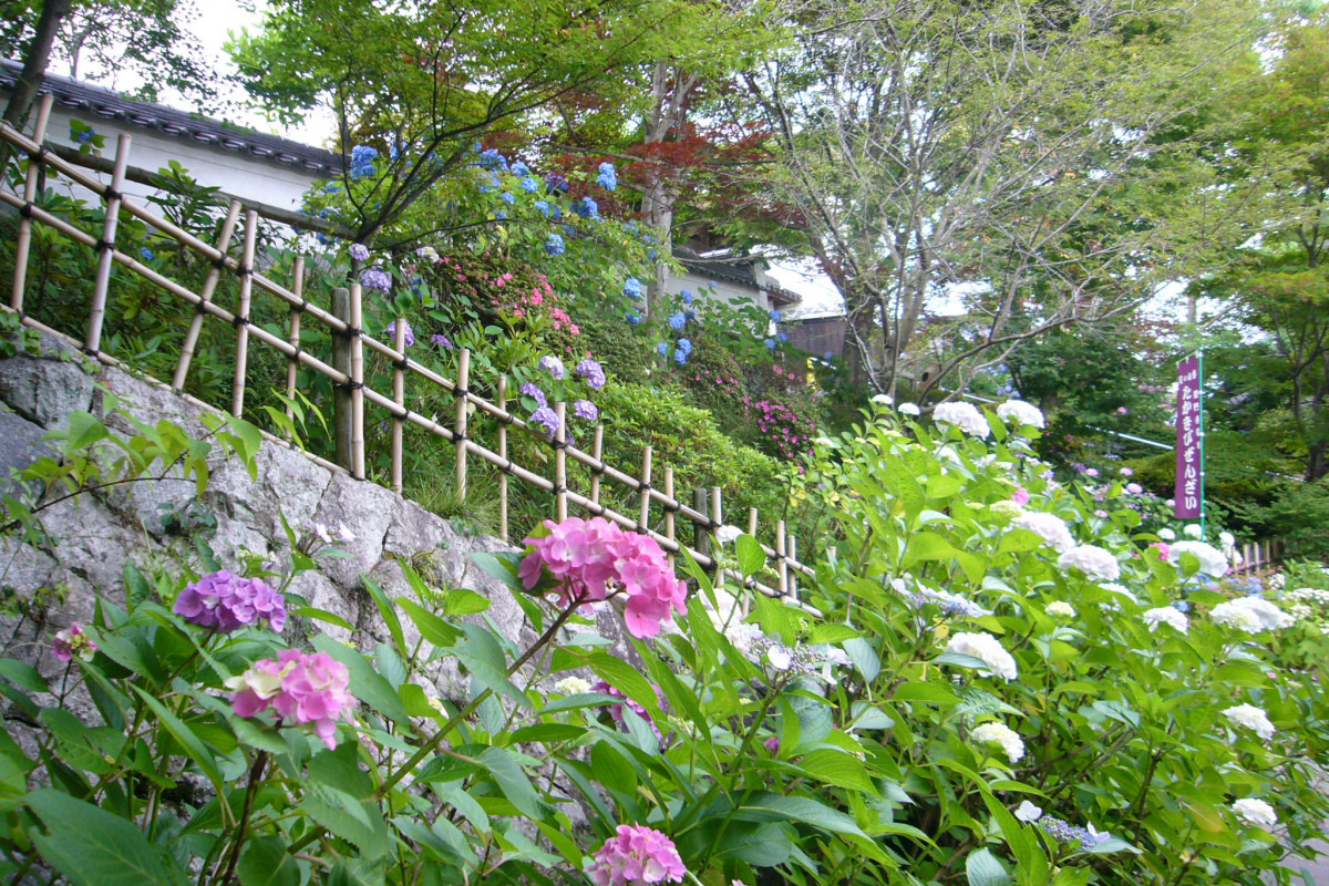 さくらやシャクナゲ、もみじなど、四季の彩りを感じられる「花の山寺」。6月中旬には約3,000株のあじさいが色とりどりに咲き、来訪者を楽しませています。