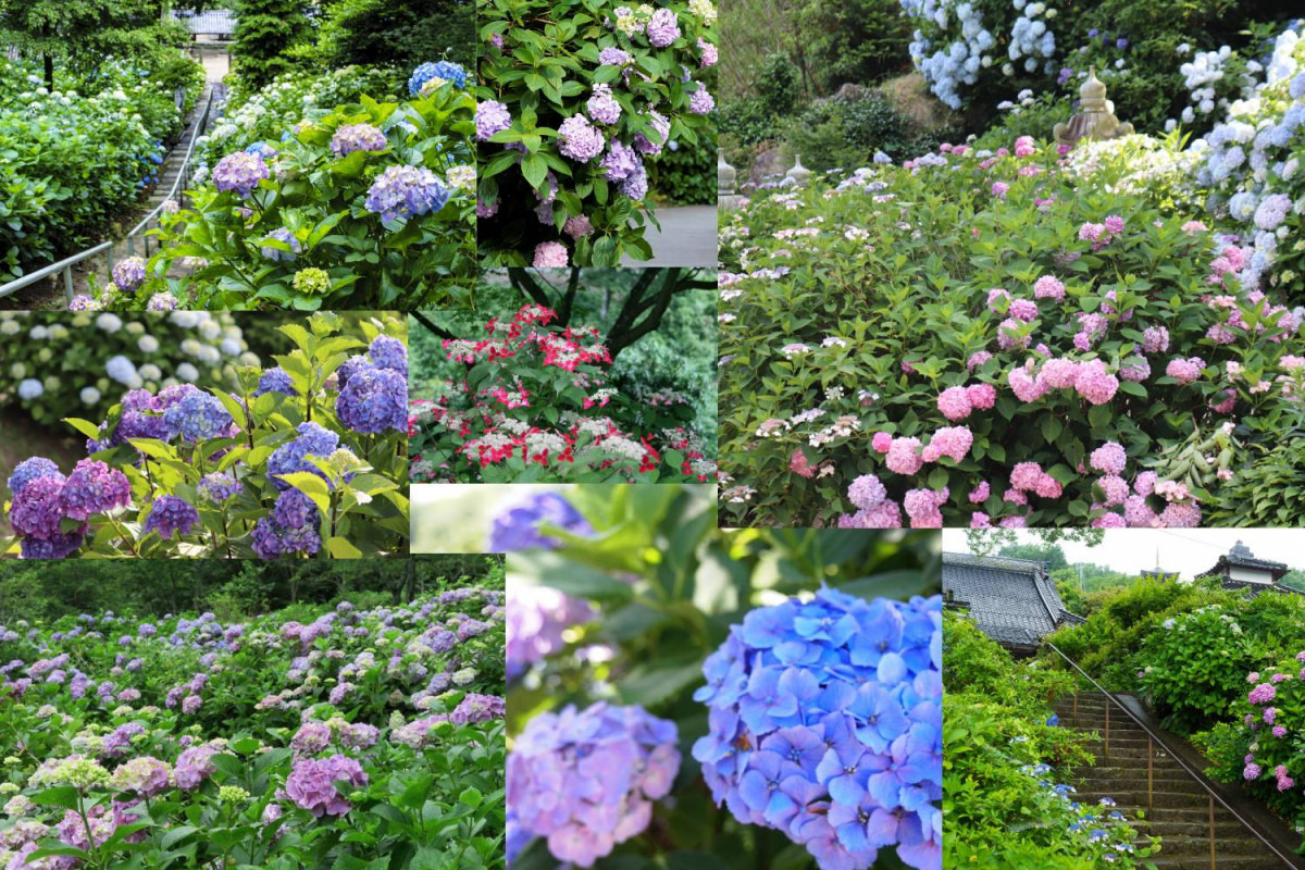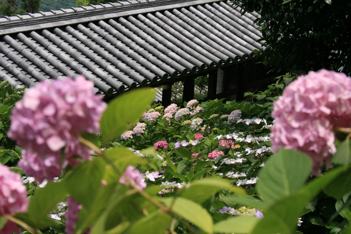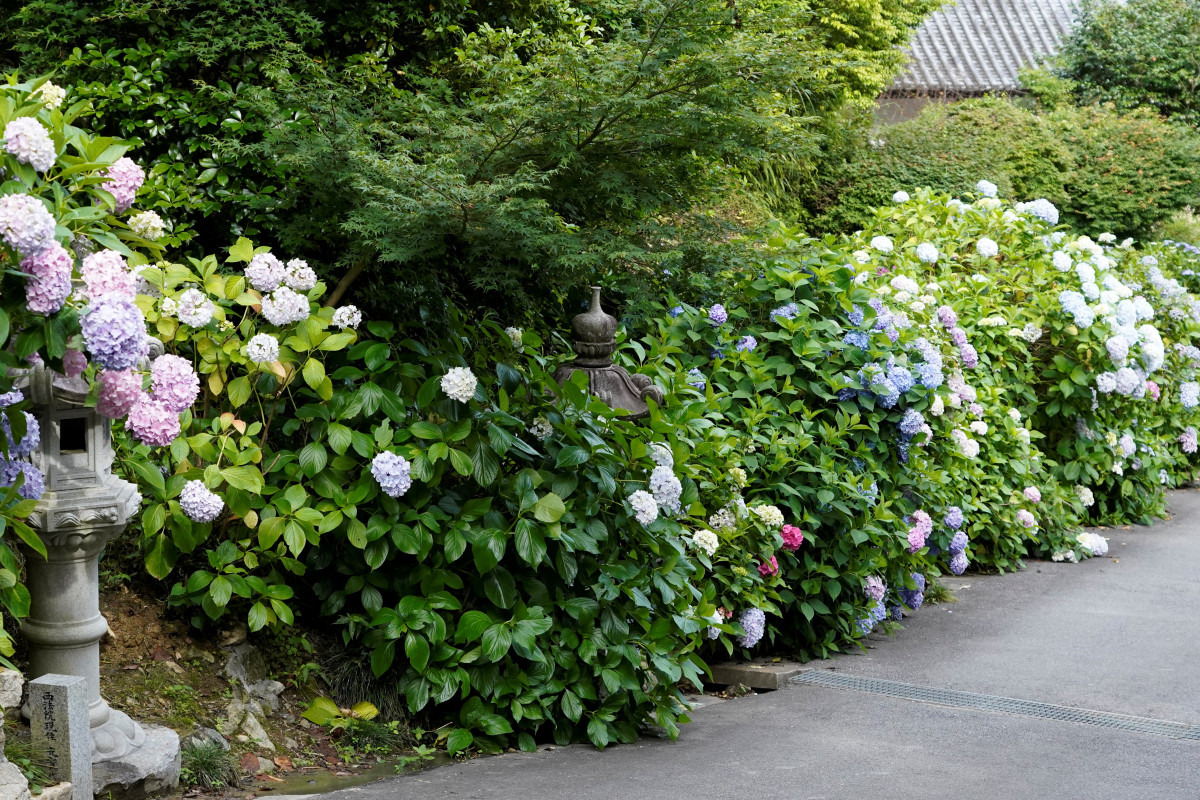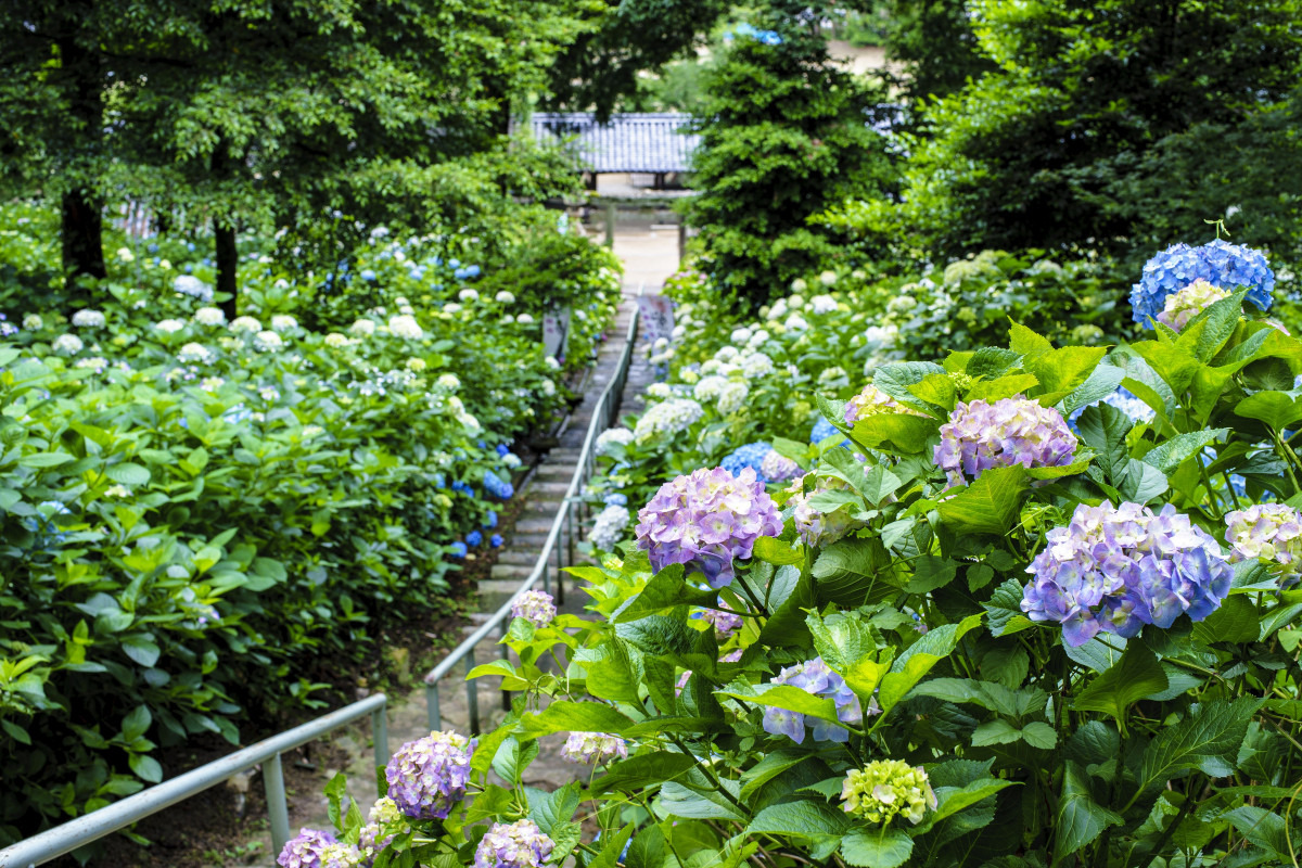 「あじさい寺」という愛称通り、参道には6月上旬~下旬にかけて約1,500株の色とりどりのあじさいが咲き、訪れる人の心を癒しています。見頃の時期には「あじさい祭り」が行われます。