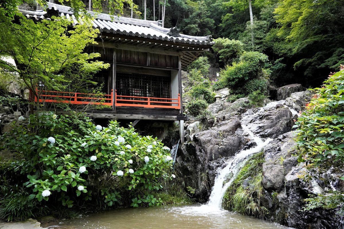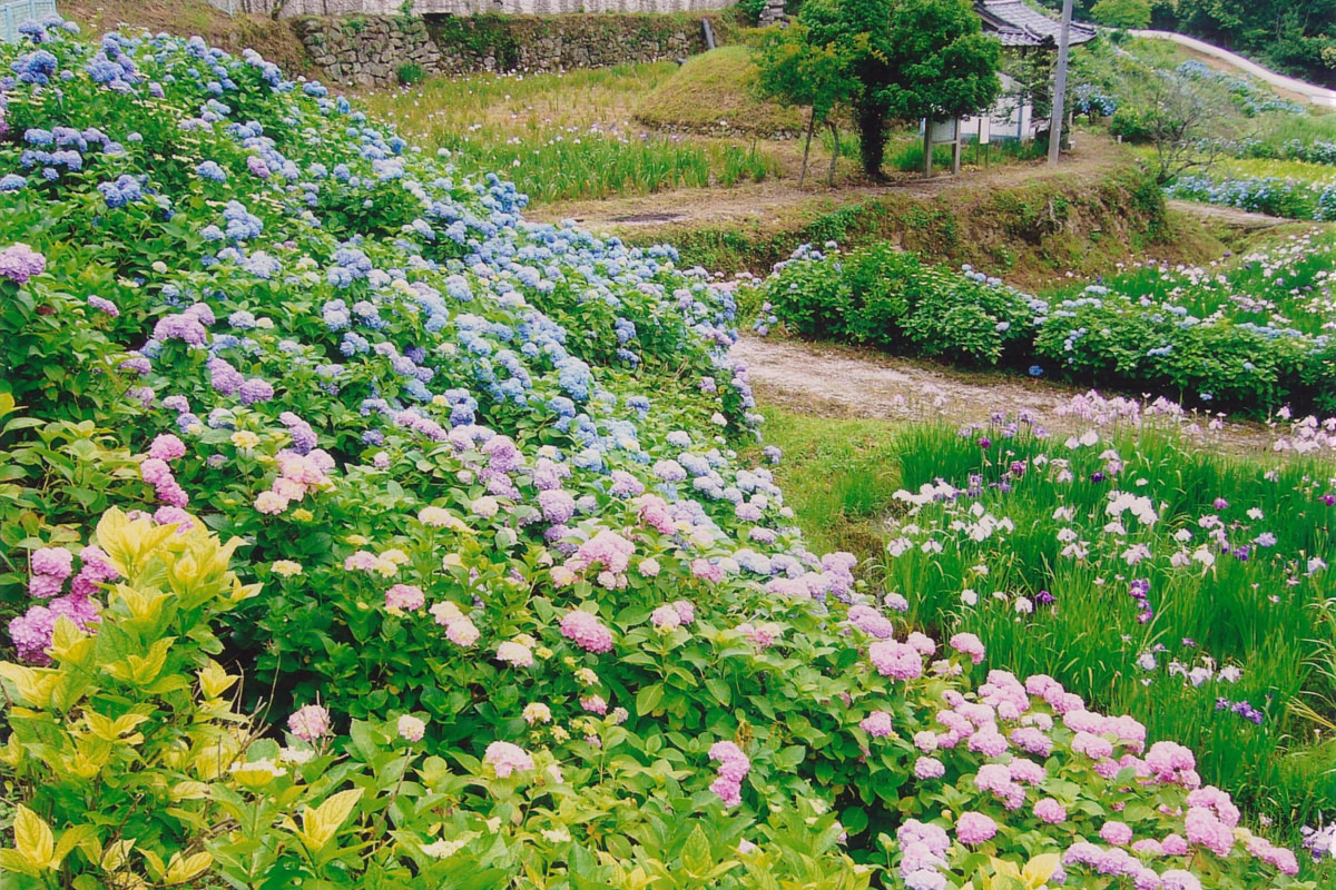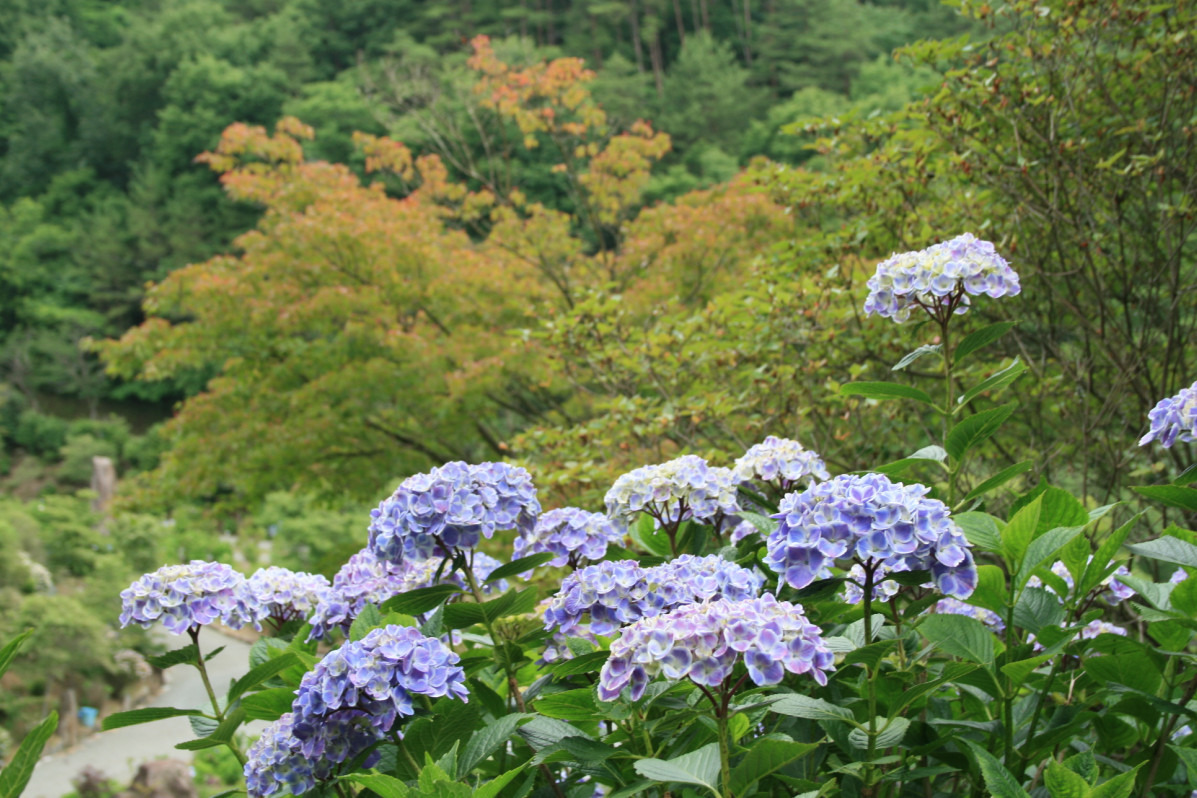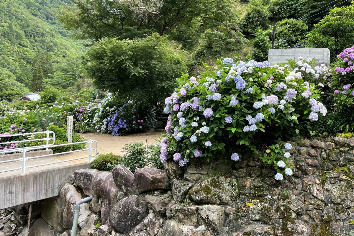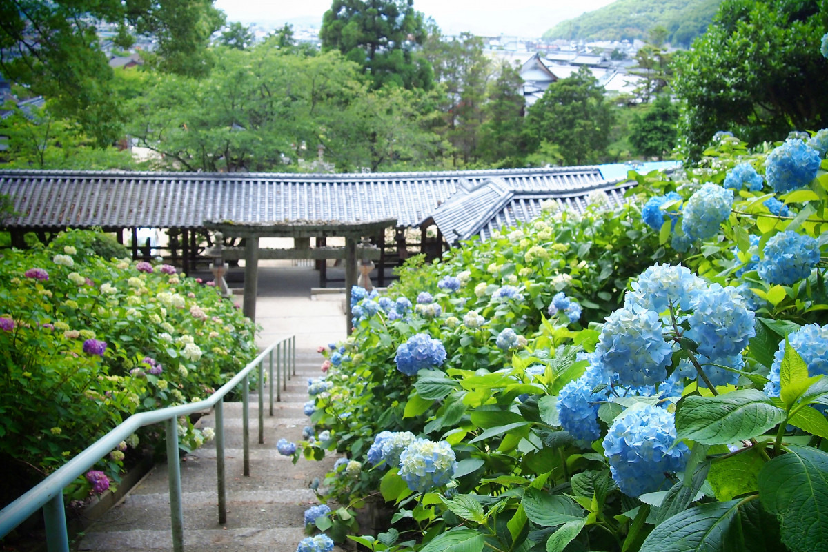 津山市の南部・神南備山のふもとにある寺。明治時代の津山城取り壊しの際に、あじさいを描いた腰高障子が贈られたのをきっかけに植えられるようになり、現在は約3500株のあじさいが梅雨時期に咲き競います。
