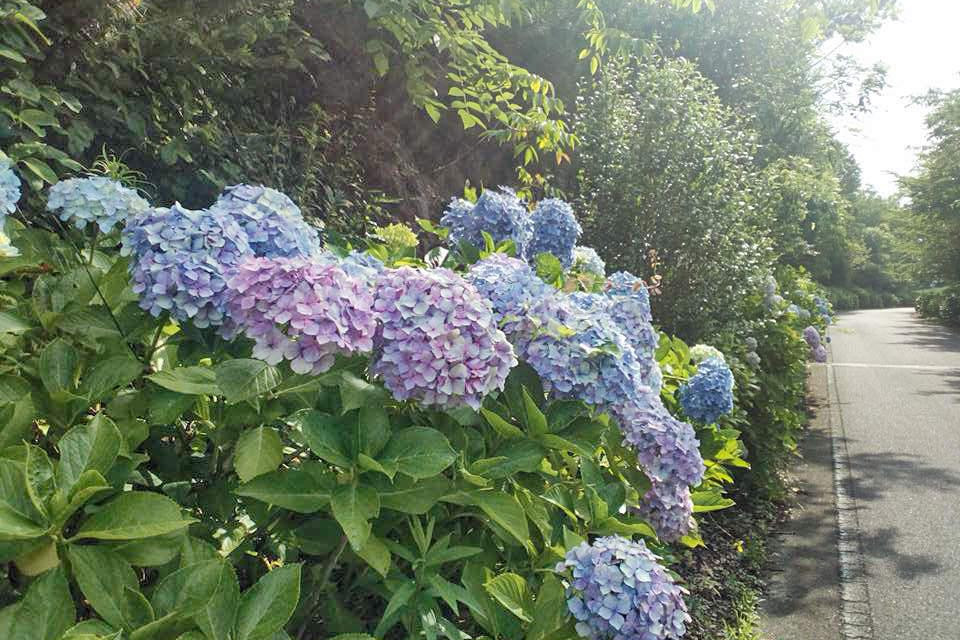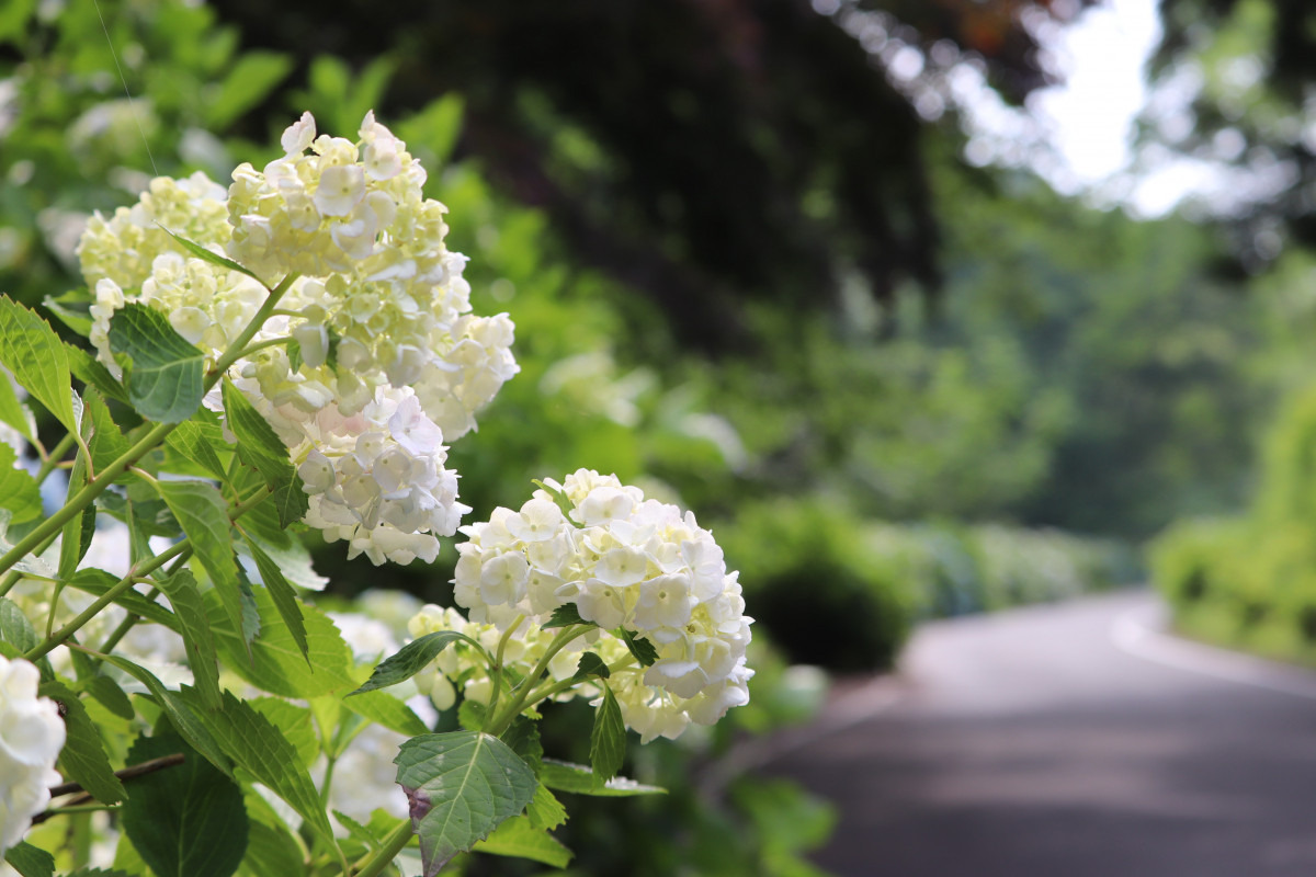 一年を通じて様々なレジャーが楽しめる公園の外周道にある、約3.5kmのアジサイロード。白や青など爽やかな色の花が道路脇に咲いています。公園入口から山頂までは車でも登ることができます。
