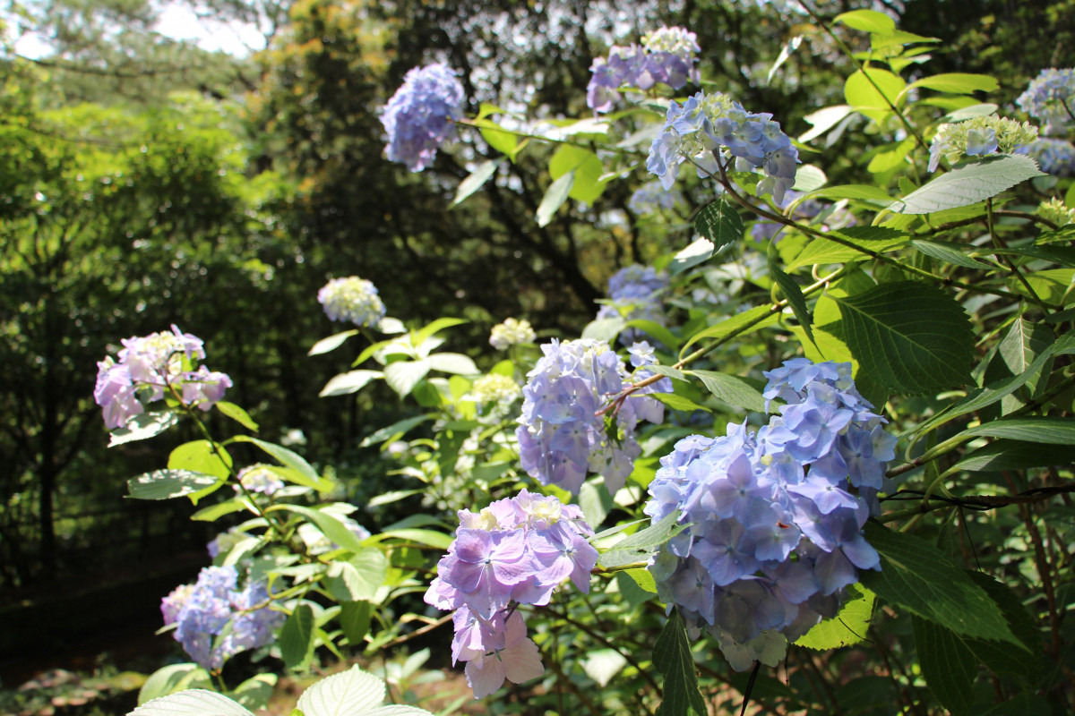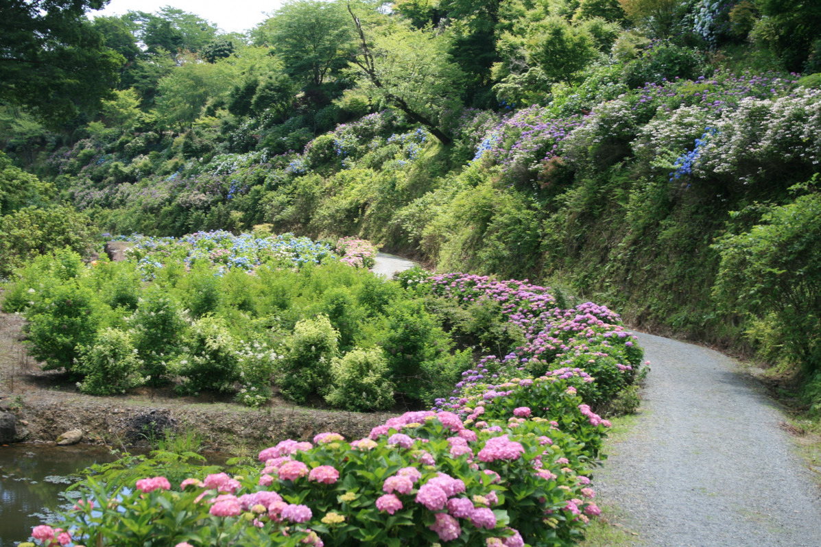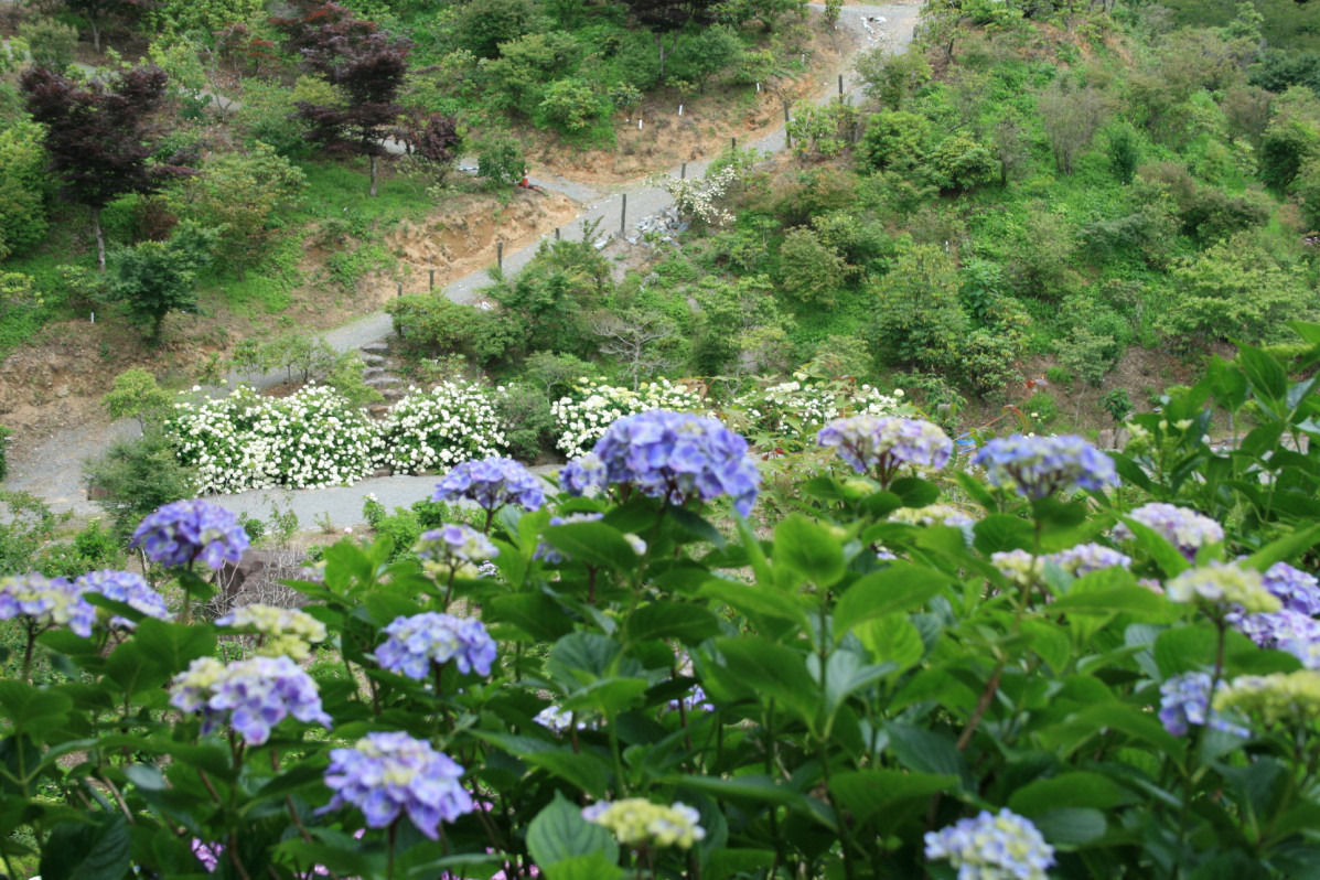 標高400mの場所にある様々な花を楽しめるスポットです。あじさいは圧倒的な数を誇り、なんと約100品種、20,000株! 20haの敷地内を散策しながら、多彩な色や種類のあじさいを鑑賞できます。