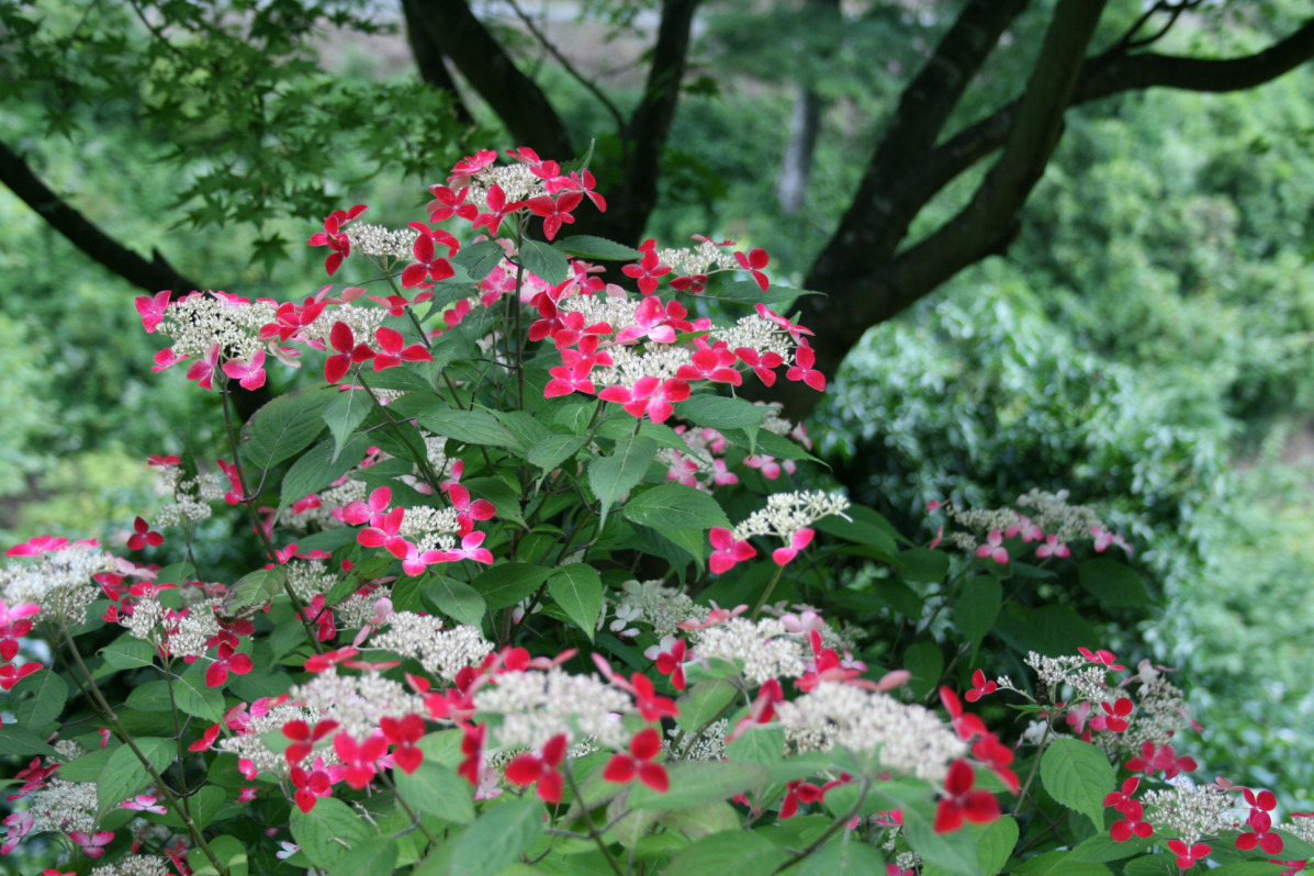 岡山後楽園の約15倍の広さの敷地に、サクラをはじめウメ、ツバキ、ツツジ、など300種以上、約15万本を植栽しており、6月中旬が見頃のあじさいは30種類約3,500株。赤松池のそばの遊歩道や「深山イギリス庭園」など園内各所で見ることができます。
