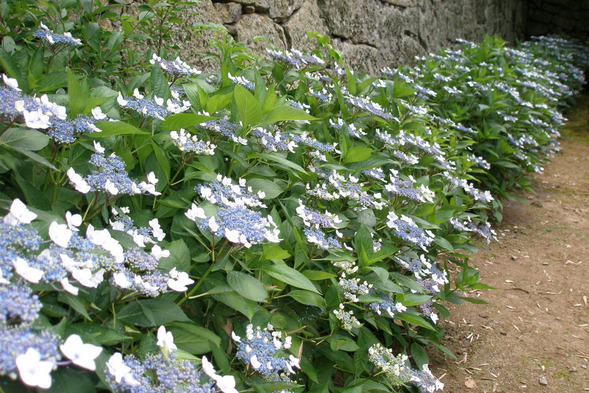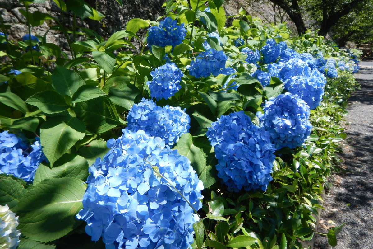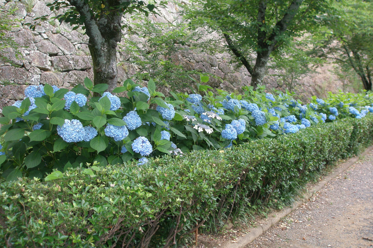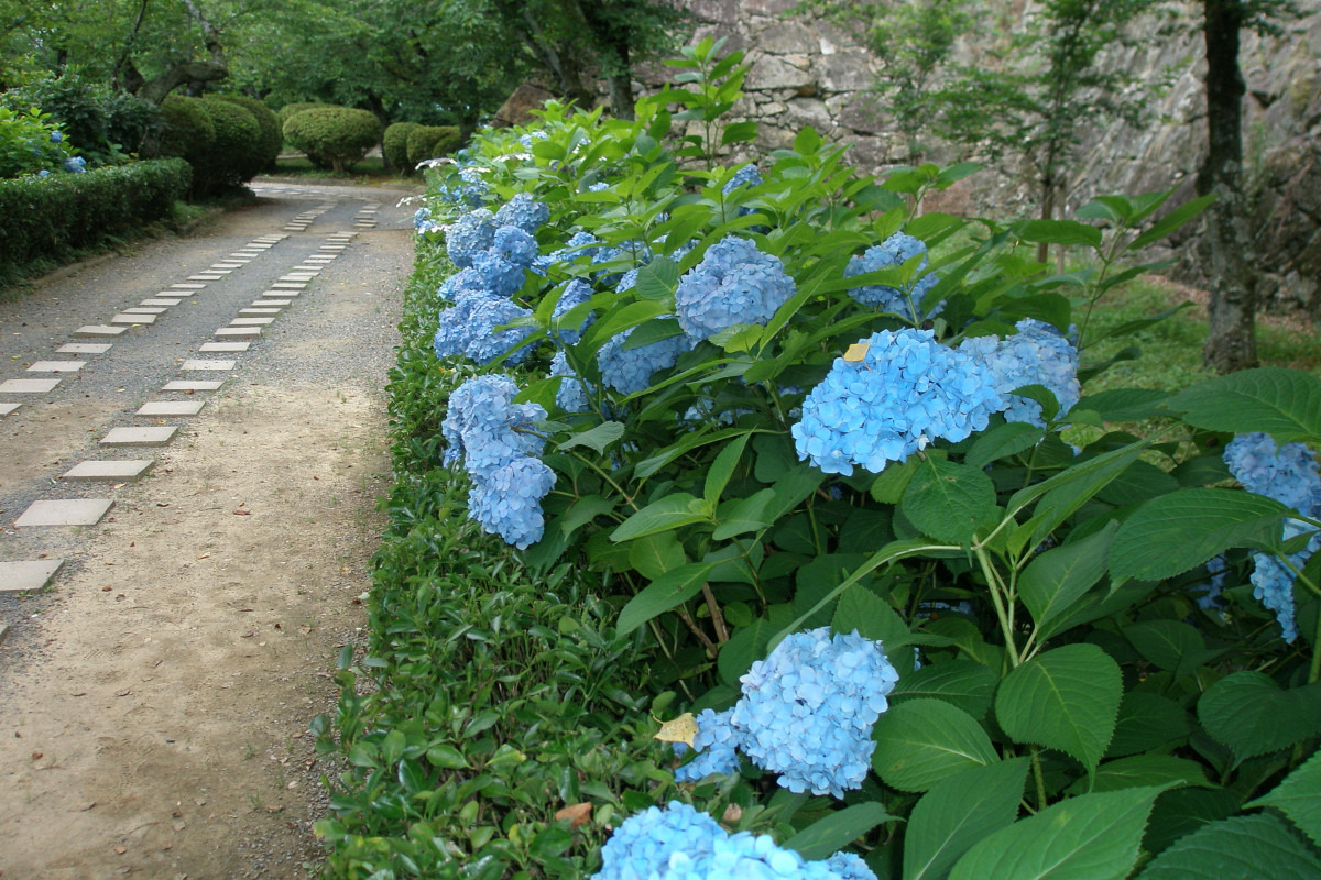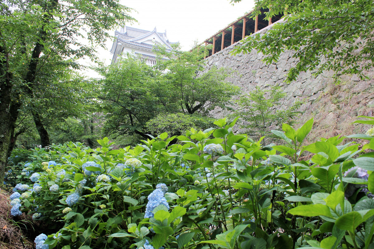桜で有名な津山城(鶴山公園)は、知る人ぞ知るあじさいスポット。特に備中櫓の下に咲く様子は、重厚な石垣や歴史的な建造物と相まって趣きがあります。青や赤紫のあじさいのほか、ガクアジサイも見られます。