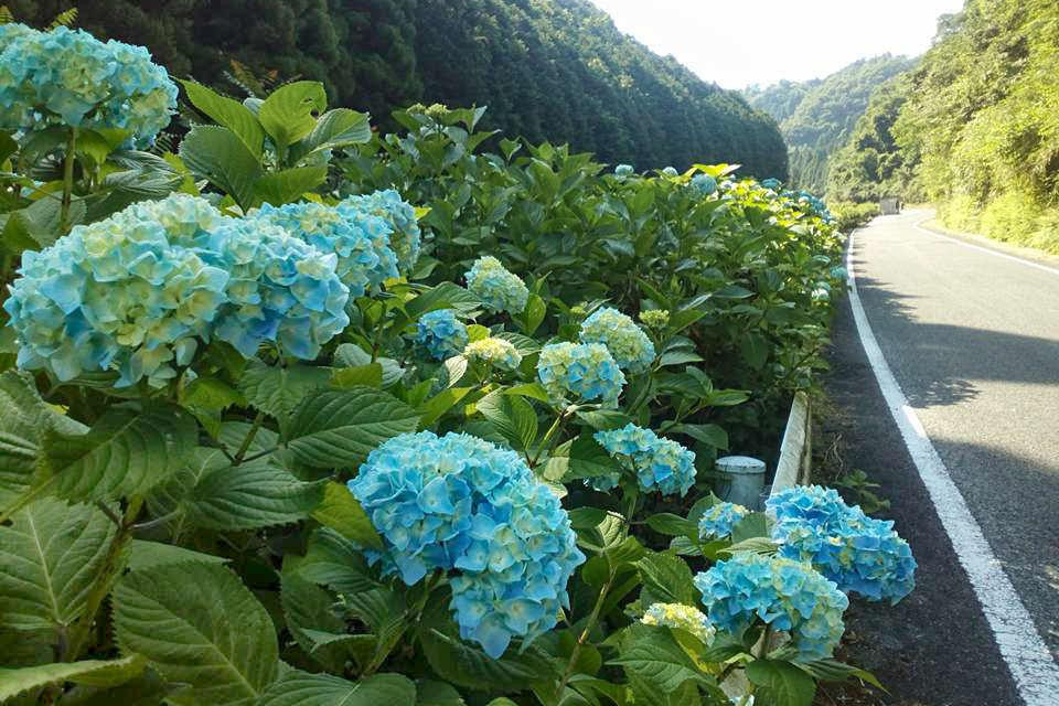 眼下に湯郷温泉街、遠くに岡山県最高峰の後山をはじめ、那岐山などの山々まで見渡すことのできる展望スポットへ続く道。約3,000株の濃い青や紫のあじさいが、山の緑に美しく溶け込んでいます。