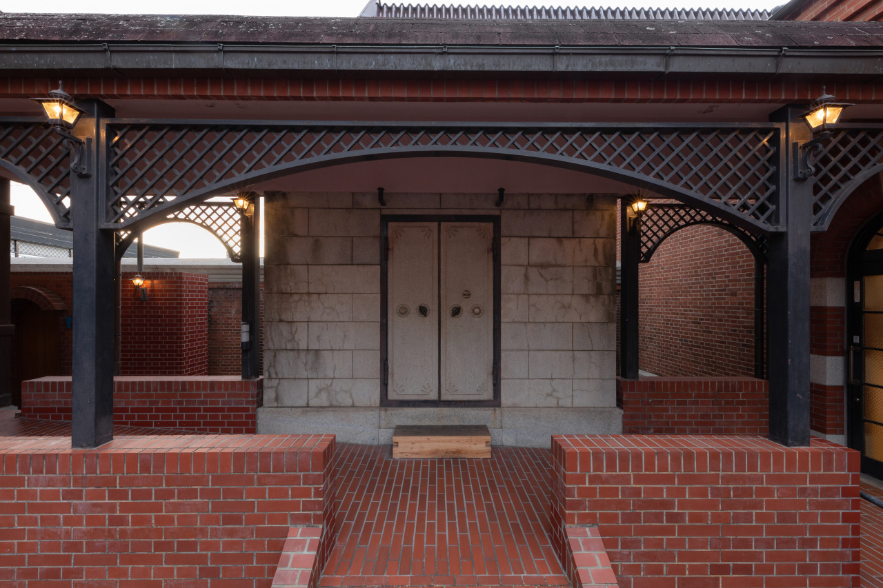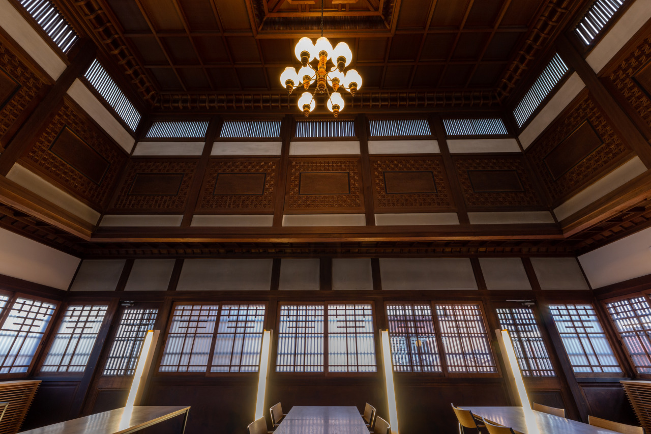 岡山県指定重要文化財にも認定されるこの建物は、木造本館と石造金庫棟、赤レンガ倉庫がコの字型に並び、大正ロマンを漂わせる外観と中庭が印象的で、寺院建築風の屋根や折上格天井、欅のカウンターなど、銀行時代の意匠を随所に残しています。