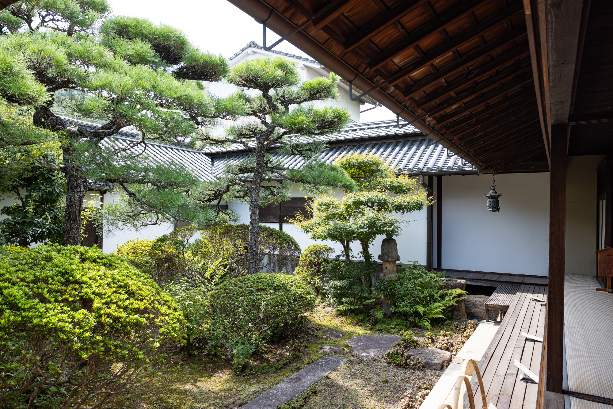 「上段の間」に面した中庭は、川向こうの嵐山を借景とした日本庭園。