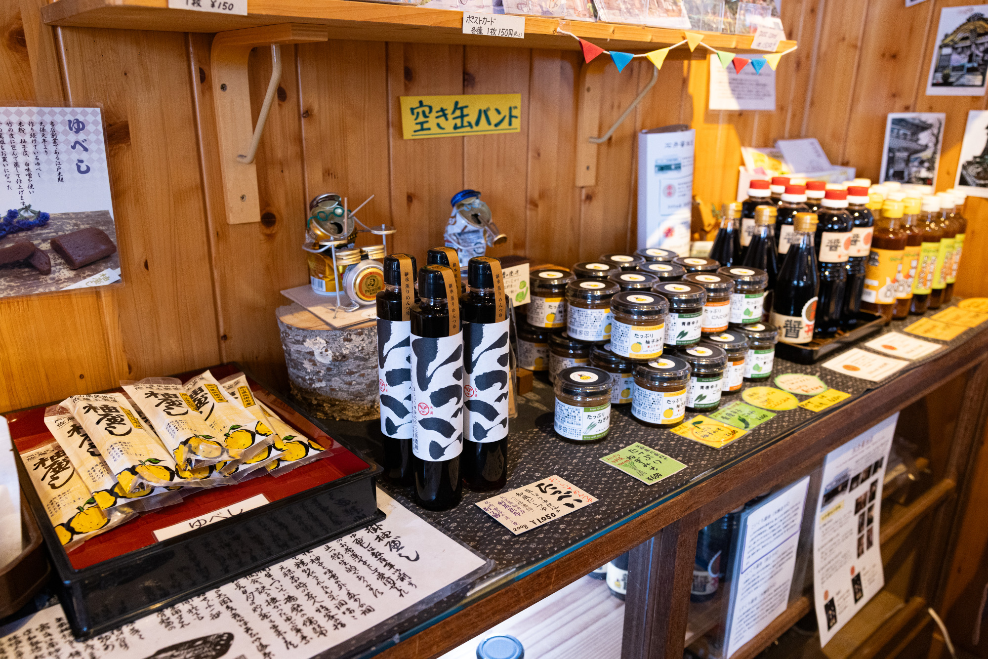 商品棚に並ぶ4種類の醤油は、どれも手造りならではの奥深い味わいです。