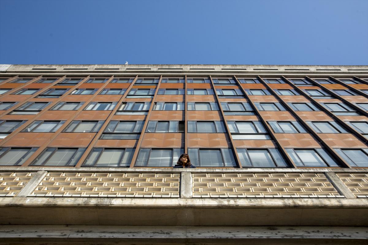 本館4階以上の全面を覆うガラス窓とスチールのパネルは「カーテンウォール」と呼ばれるもの。