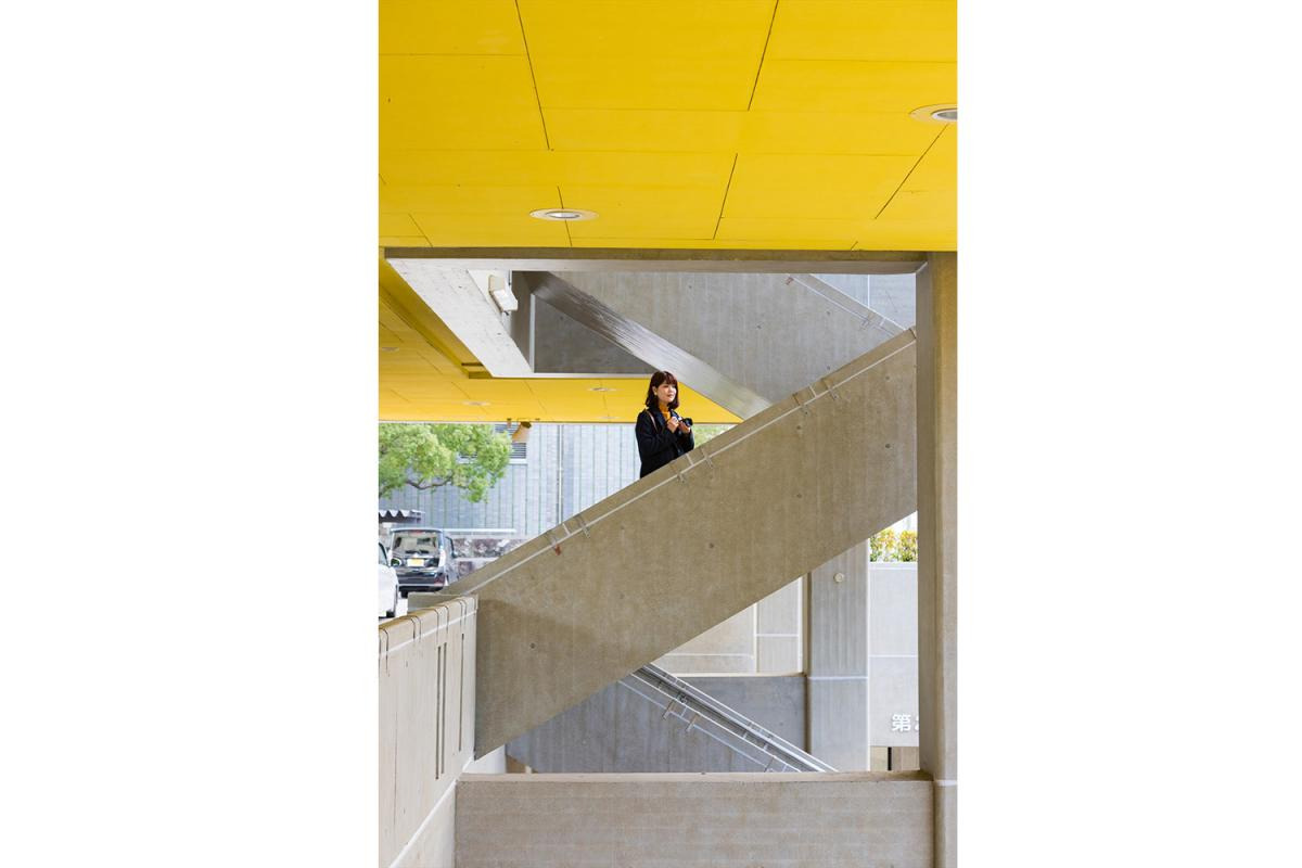 3階まで吹き抜けのエレベーターホールがあり、明かりは自然光とスリットからの照明のみの、湾曲した打放しコンクリートの幻想的な空間となっています。