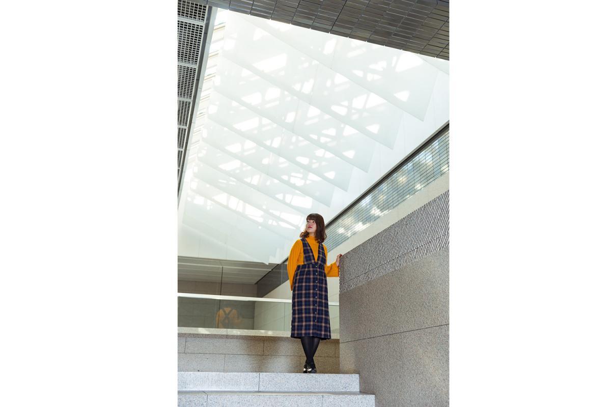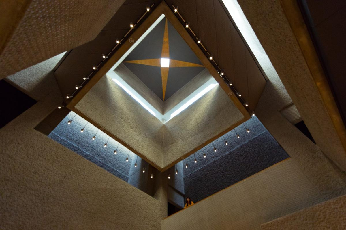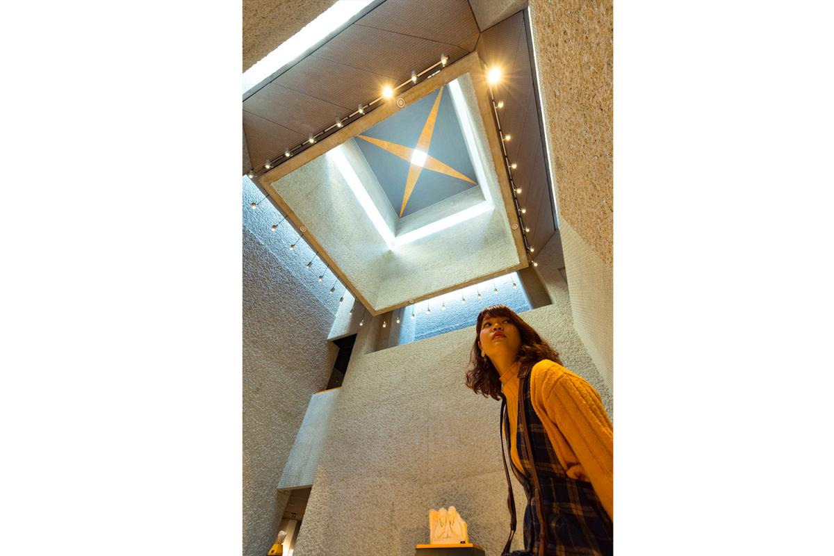 2階展示場に向かう階段から見えるトップライトは、アートフォーラム(屋内広場)を木漏れ日のような柔らかな光で照らしてくれます。
