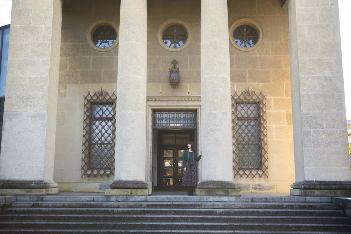 玄関の巨大な柱は、一見大理石に見えますが実は鉄筋コンクリート造で、石の粉をモルタルに混ぜており、左官技術によって施されています。