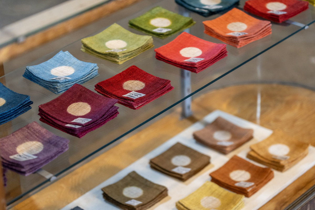 卒業後、加納さんは東京の出版社に就職し、出版社退職後に機織の教室を約6年間主宰します。その間に結婚し、長女を出産。しかし、1977年(昭和52年)、実家の酒屋を継ぐため家族で勝山へ戻ることになります。最初は家業(酒屋)が中心で、染織はあくまで趣味だったそうですが、お酒の配達や子育てをしながら、細々と制作を続けたそうです。屋号に入っている「草木染」への出合いもこの頃でした。「勝山は林業が盛んで特にヒノキやスギが有名です。だからこの木の皮で糸を染めてみようと思って…。最初は染めた糸で着物を織り、その後徐々に布も染めるようになりました」と加納さん。地元木材の活性化を図る勝山木材ふれあい会館の依頼で、館内の地域特産品販売コーナーに草木染のハンカチを出品することもあったそう。「勝山は自然がいっぱいなので、草木染の素材には困らないんです。木材だけでなく、ヨモギや梅などいろいろな植物で染めました」。自然豊かな土地柄が、加納さんと草木染を出合わせることとなったのです。
