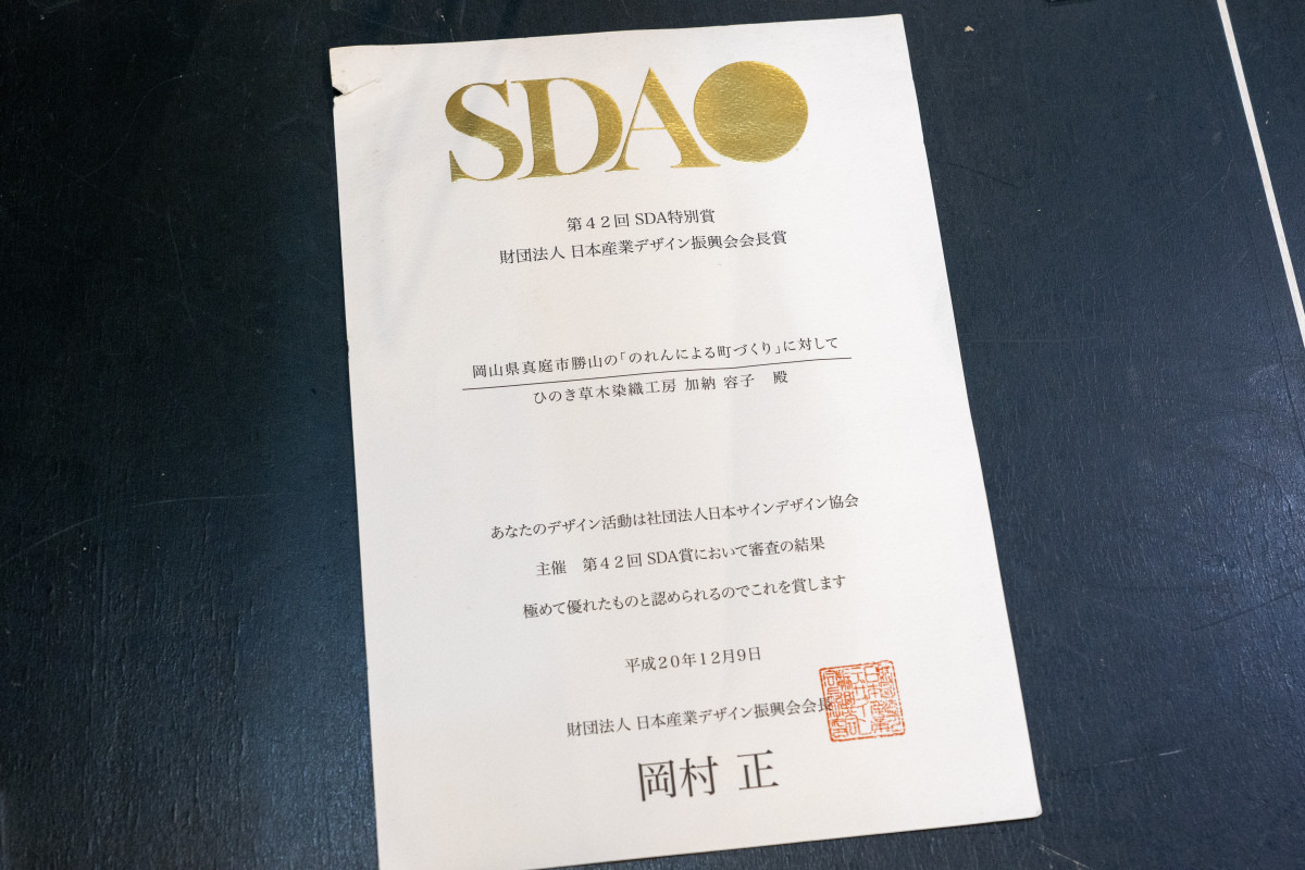 江戸時代に出雲街道の宿場町として栄え、1985年(昭和60年)岡山県初の「町並み保存地区」に指定された真庭市勝山で、「ひのき草木染織工房」を営む染織家の加納容子さん。東京の美術大学を卒業後、就職・結婚。機織の教室を主宰した後、実家の酒屋を継ぐため勝山にUターンします。家業の傍ら制作した暖簾(のれん)が近所の人の目にとまり、制作を希望する人が増えたことから、平成8年(1996年)、住民有志が「かつやま町並み保存事業を応援する会」を発足。そこから毎年暖簾を制作し続け、町並み保存地区の通りのお店や民家に加納さんが制作した暖簾が次々とかけられ、今では「のれんの町・勝山」と言われるほどに。その活動は県内外で高く評価されており、暖簾目当てに勝山を訪れる人が後を絶たないなど、地元の観光振興に大きく貢献しています。
