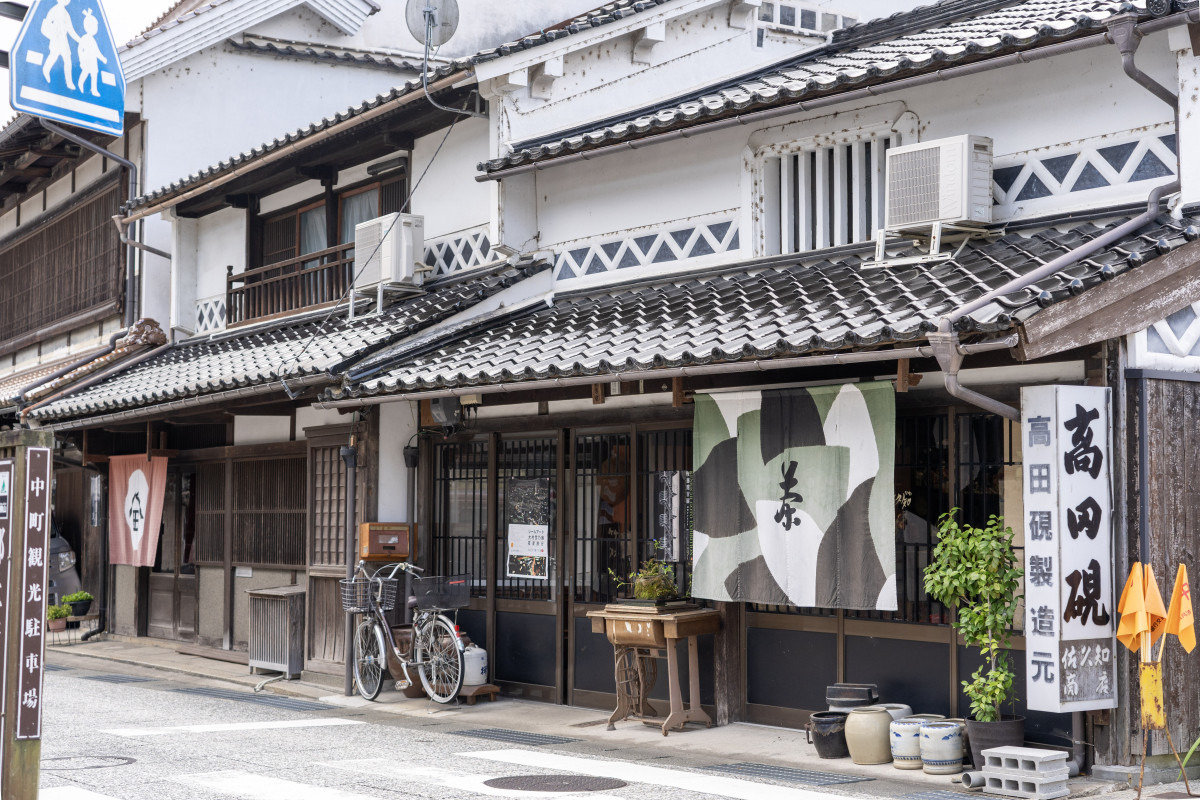 酒屋を営みながら染織を続ける日々の中、加納さんは店先に一枚の草木染めの暖簾をかけました。「当時、23時まで酒屋を営業していたんですが、夜遅い時間にもお酒が売れたらと思って、ひのきの木の皮でお月様の柄を染めた暖簾をかけたんです」と加納さん。間もなく、ご近所から「これいいな。うちにも作ってほしい」と声がかかります。酒屋と同じ並びの家から春夏秋冬の4枚の暖簾制作依頼があり、それらの暖簾がさらに町内で話題となり、「うちもかけたい」と、次々に声がかかるようになります。同時に、暖簾をかけることで町に良い影響も現れていました。通りを歩く観光客とお店の人々との間に暖簾を通じて会話が生まれ、町に活気が現れはじめていたのです。そのことに気づいた住民たちによって、徐々に「町に暖簾を」という機運が高まっていきました。その結果、平成8年(1996年)住民有志による「かつやま町並み保存事業を応援する会」が発足。住民の手で町に暖簾をかける取組がスタートし、制作費の半分を行政が負担することに決まりました。初年度は16軒分の暖簾が制作され、家々に色鮮やかな暖簾がひらめく「のれんの町」が誕生。ここから加納さんの本格的な暖簾制作がスタートすることになります。