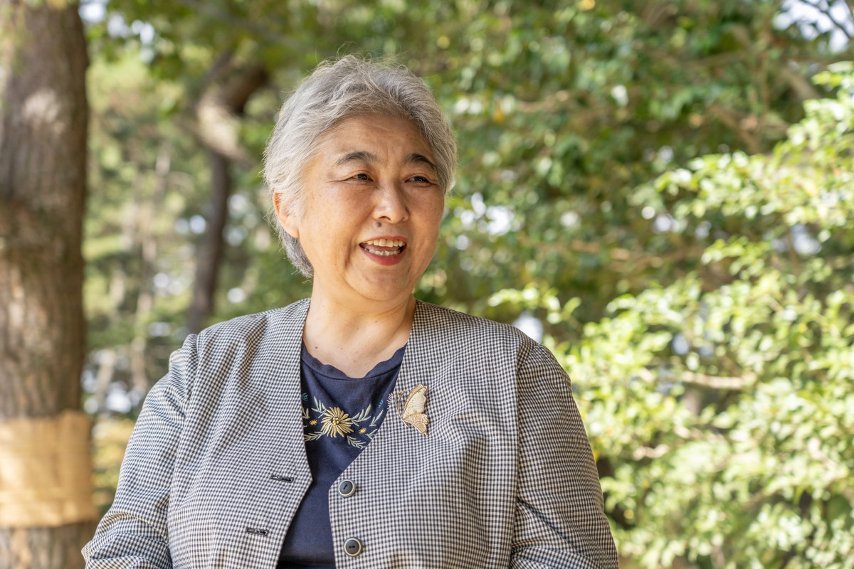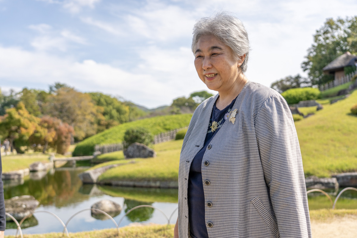 岡山県郷土文化財団の主任研究員として、長年にわたり岡山後楽園や岡山城に関する研究を続けている万城あきさん。岡山市生まれで岡山市育ち。岡山大学文学部史学科卒業後は「郷土の情報を伝える仕事ができたら」と地元のテレビ番組制作会社に入社し、備前焼や郷土出身の文学者・坪田譲治などの紹介番組の制作に携わっていました。結婚を機に一度岡山を離れ関東へ。ご主人の仕事の関係で渡米後、お子さんが幼稚園に入るタイミングで帰国して実家のある岡山に帰郷。その時に出会ったのが、岡山県郷土文化財団が主催する「内田百閒文学賞」のコピー作成のアルバイトでした。その後、学芸員の資格を持っていたことと、大学時代に古文書を学び、くずし字が読めたことから内田百閒や岡崎嘉平太の資料整理に携わります。やがて、「岡山後楽園史」の編纂を担当。その経験を活かし、平成17年(2005年)から始まった後楽園の専任ボランティアガイドを養成する「後楽塾」では、講師として開講当初から中心的な役割を果たしています。
