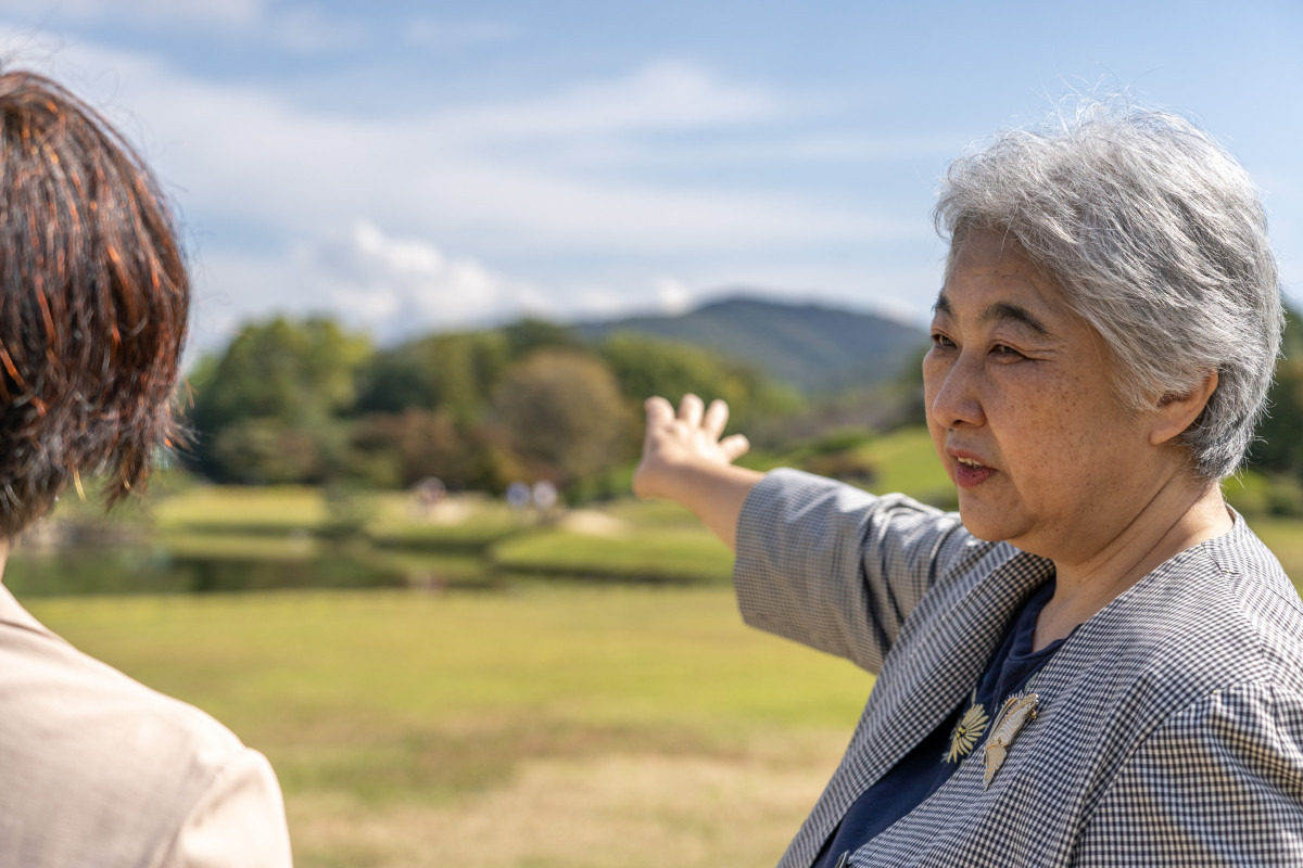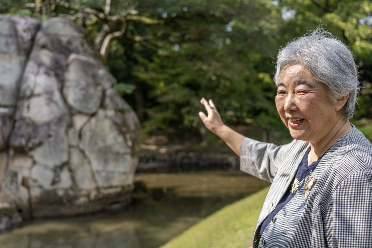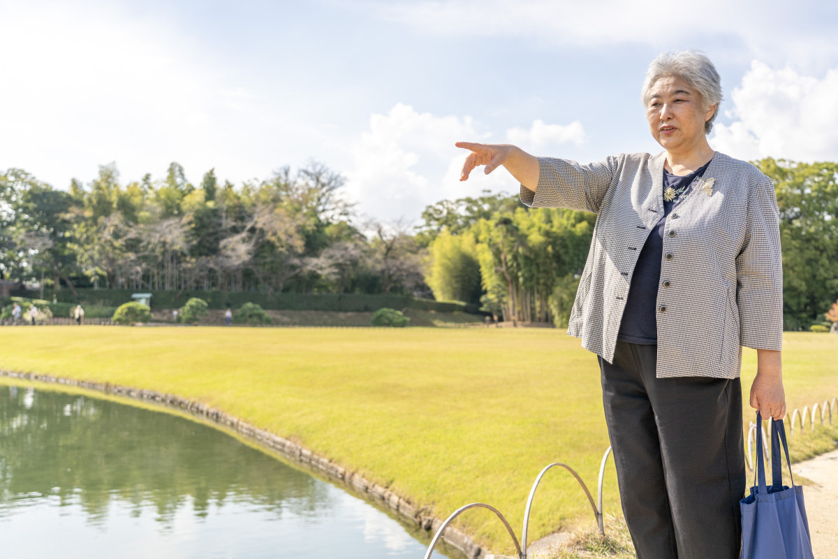 「ガイドの知識として、後楽園が300年間どのように保たれ、どのように変わってきたか、また何故変わってきたかを知ることが大事だと思います。その歴史を伝えることを“観光”にも繋げていけたら」と語る万城さん。実際長い歴史の中で、藩主が変わって池の島の数が増えたこともあったとのことで、そんな話を園内散策しながらガイドさんから聞けば、理由や背景により興味が湧いてきそうです。また、反対にずっと変わっていないものもあります。それが後楽園のガイドでは絶対外せないという延養亭。「延養亭は築庭時からずっとあの場所から変わっていないんですよ。岡山藩二代目藩主・池田綱政が作った最初の一歩がずっと守られている。なぜこの場所にこの建物を作ったのか? 延養亭を訪れ、そこから見える景色を目にすれば、綱政がこの庭園に何を求めていたかが分かります」。