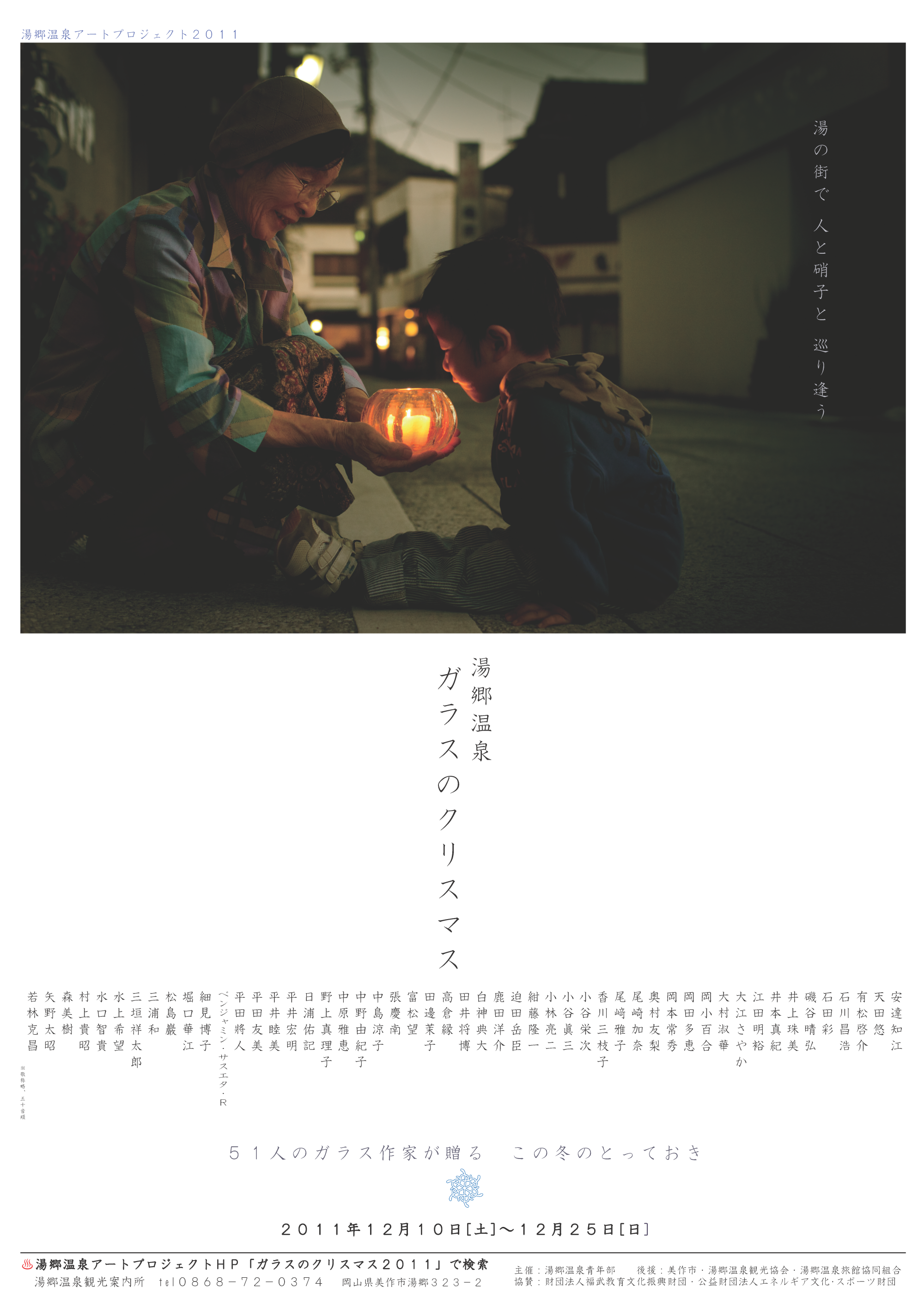 湯郷温泉街は年末年始、温泉宿泊客で賑わいますが、クリスマス前の集客が少ないことが課題でした。そこで、敷居の高いイメージがある旅館やホテルのロビーにガラス工芸品を展示することで、気軽に立ち寄れるギャラリーのような雰囲気を湯郷温泉街全体で作れないかと考え、工芸イベント「ガラスのクリスマス」を企画。県内ガラス作家の全面協力のもと約2,500~3,000点もの作品が温泉街に集められたこのイベントは、湯郷温泉旅館協同組合や美作市からも支持され、2011年~2015年まで年1回のペースで開催。初年度は約5,000人もの来場者を集めるなど、街の賑わいづくりと誘客に大いに貢献しました。