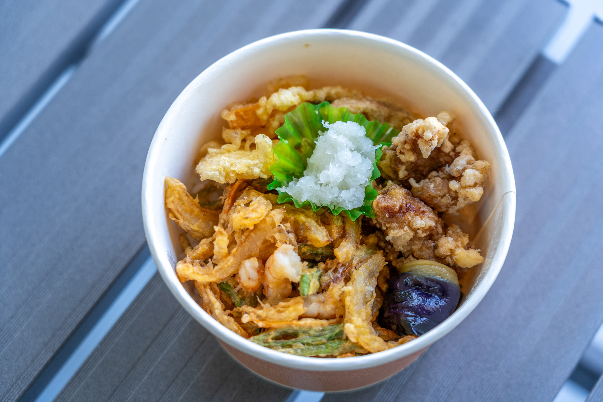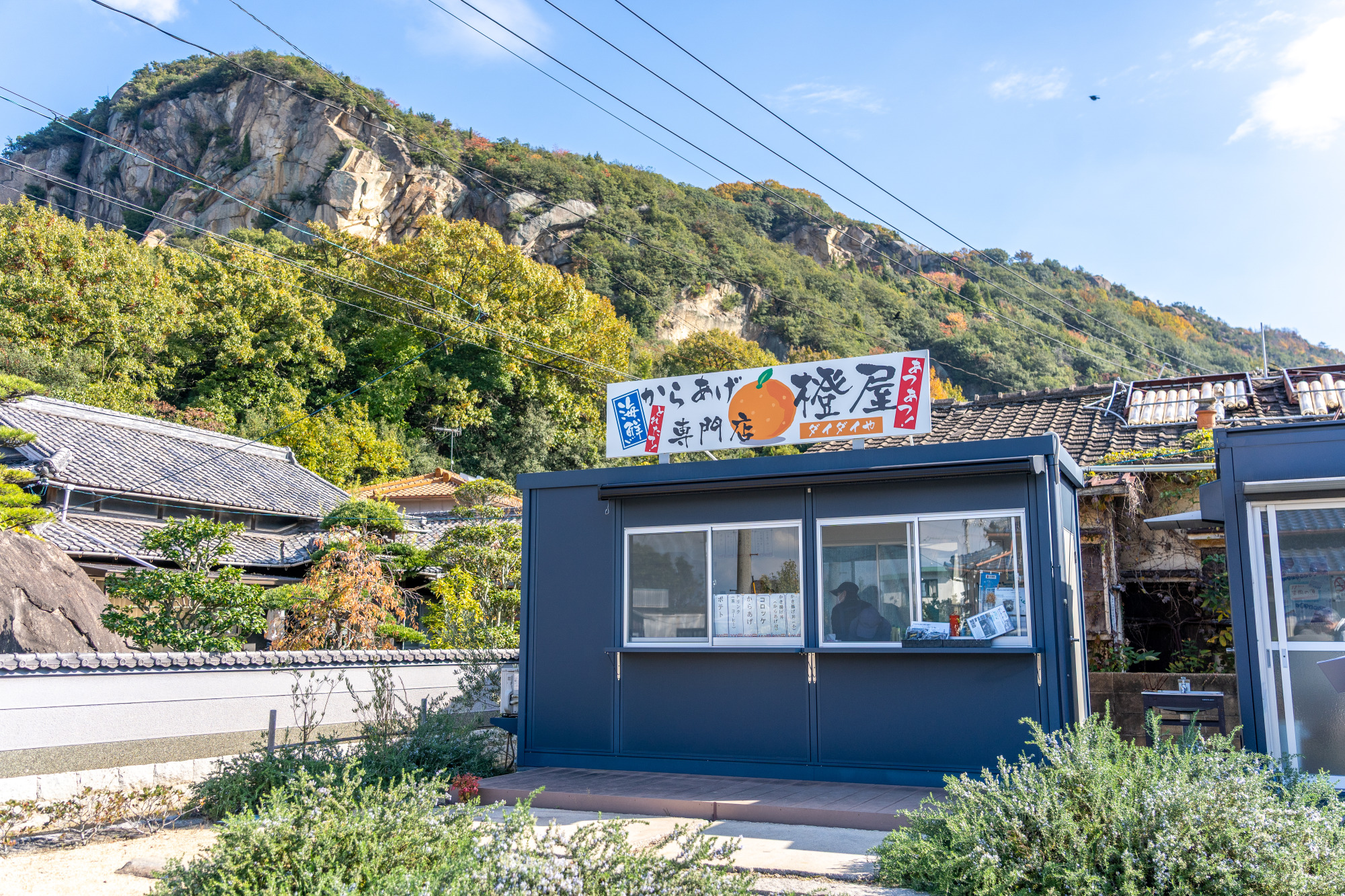 日本遺産認定をきっかけに島を訪れる観光客が増えましたが、展望台のある金風呂地区は食事場所などの受入体制が十分ではありませんでした。そこで、令和4年(2022年)海鮮からあげ専門店「橙屋(だいだいや)」をオープン。近海で獲れた海産物のから揚げ丼や、笠岡産鶏もも肉のから揚げなど地産地消の食事を提供しています。現在は週一回水曜日のみの営業ですが、団体の場合は事前に予約すれば、他の曜日も営業してくれるそうです(鶴田石材TEL:0120-68-2120)。