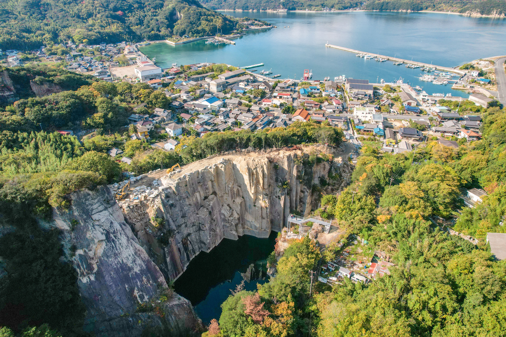鶴田さんの取組の中で、北木島の知名度向上に大きな役割を果たしたのが、平成29年(2017年)に完成した「石切りの渓谷展望台」です。この展望台は、島で唯一、今も石切りが行われている同社の丁場(採石現場)の中に建設されました。その背景には産業観光としての役割に加え、危険の伴う石工の仕事と、特殊な技術で切り出される石の価値を感じてほしいという鶴田さんの想いがありました。一番の見どころは、昭和30年代に採石が機械化して以降、高品質な石を求め山の上から地下まで掘り進めた結果生まれた断崖絶壁の風景です。高さ約60メートルの展望台からの眺めは迫力満点で、採石によって切り出された岩肌と美しいエメラルドグリーンの湖面を望むことができます。現役の採石現場を安全に見学できる希少な場として一般公開され、ダイナミックで特異な景観が話題となりました(公開時間は同社のHP参照)。今では、年間約3,000人が訪れる人気スポットになっています。