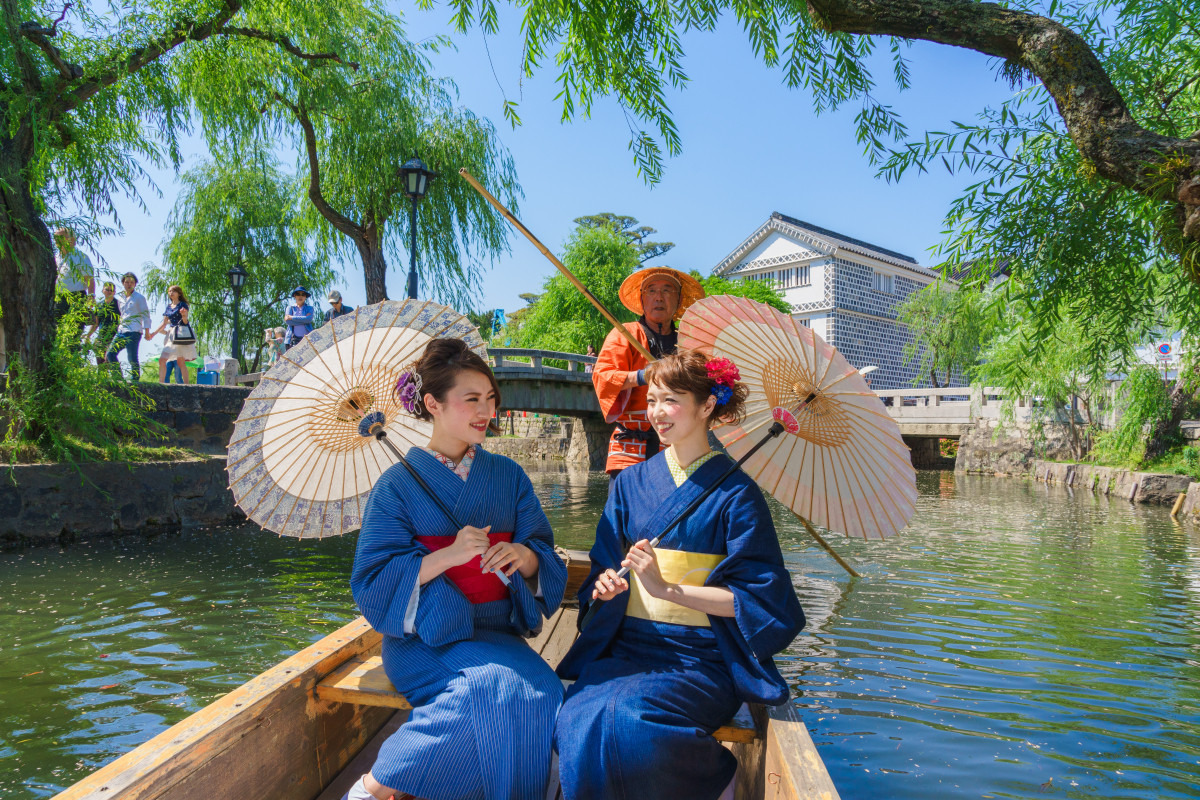 美観地区の白壁の町並みを、倉敷川から観光できる「くらしき川舟流し」。はっぴ姿に菅笠(すげがさ)を被った船頭さんが、観光案内や白壁のいわれなどを紹介してくれます。かつては物資の往来があった倉敷川、ゆったりとした時間を楽しみながらタイムスリップしてみませんか?(所要時間20分程度)