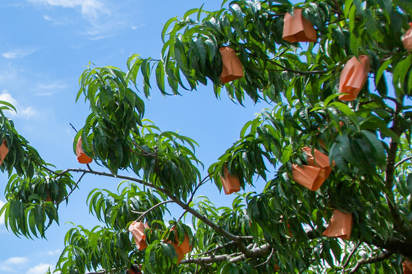 そんな岡山の白桃栽培は、枝いっぱいに付いた蕾を摘み落とすことろからはじまります。徐々に実を太らせたら、木の勢力、枝の強さを見極め、数回に分けて摘果を繰り返します。そうして残った幼果に、1玉、1玉、丁寧に袋をかけていくのです。当然ながら、これらはすべて手作業で行われています。人の感覚、長年の経験が頼りとなる繊細な仕事が、岡山の桃作りを支えているのです。