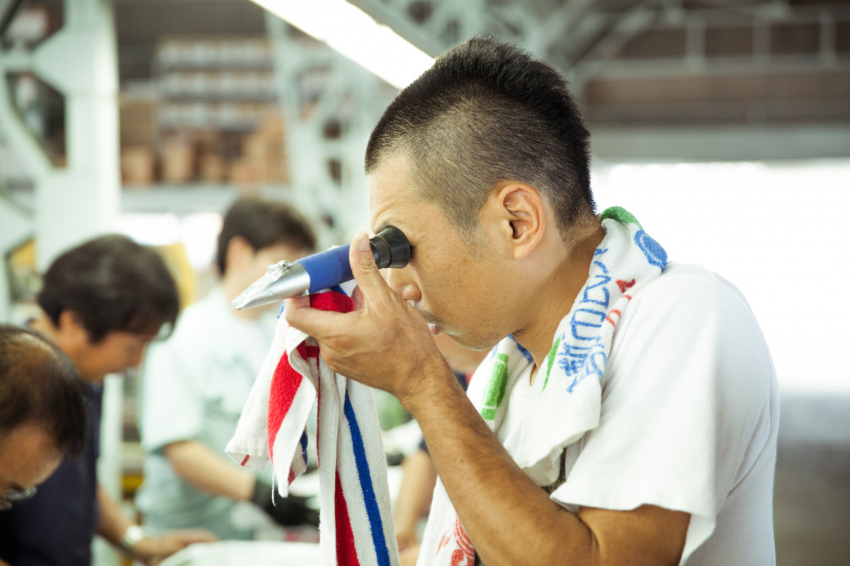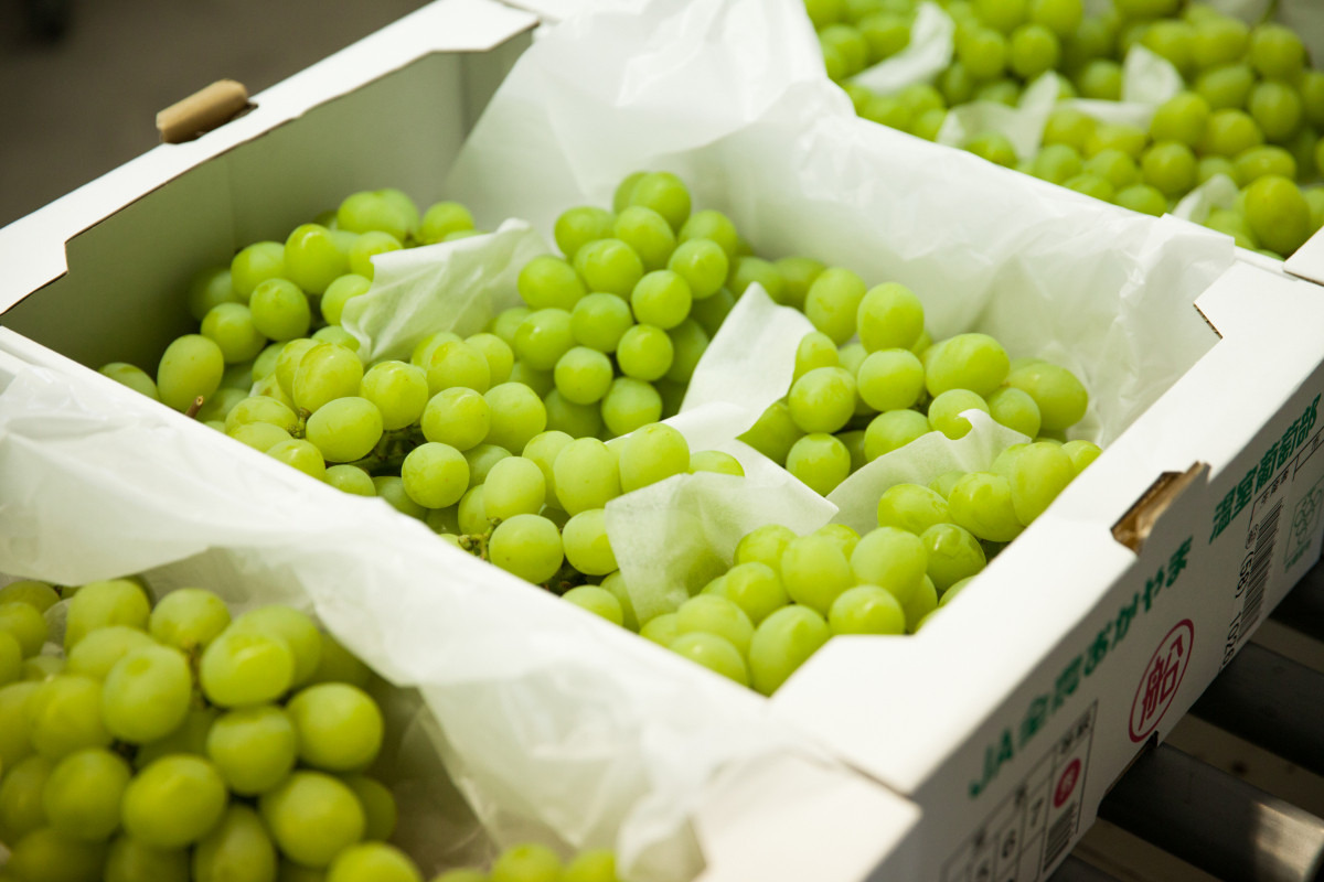 岡山のマスカットは加温栽培と冷温栽培の両方が行われているため、出荷は5~11月までと長期間。出荷時期には、選果場に収穫したばかりのマスカットが集まります。糖度を確認し、傷んだ粒や汚れがないか確認したら、いよいよ出荷の時を迎えます。