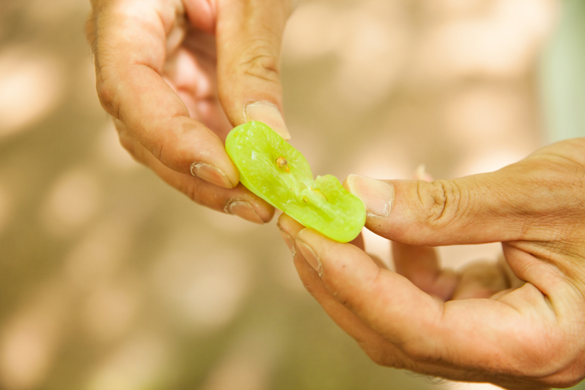 マスカットは、ほんのり黄色がかった状態が食べ頃で、食べる1~2時間前に冷蔵庫で冷やすと、さらにおいしさが増します。「皮と実の間にこそ旨みが多く含まれているので、ぜひ一緒に口に入れてほしい。皮がはじけた瞬間に広がる香りと甘みは格別です」とマスカット農家・平本さん。皮の表面には「ブルーム」と呼ばれる白い粉がついていますが、これはぶどうから分泌される糖分やミネラルです。脂質成分もあるため、雨水から実を守り、果汁の蒸発を防ぐバリア役割も兼ねています。このブルームは触るとすぐにはがれてしまうことから、房の管理や箱詰め作業には大変気をつかいます。ブルームがあるマスカットは、新鮮で上質な証であり、農家の技術の高さと惜しみない愛情の結晶なのです。