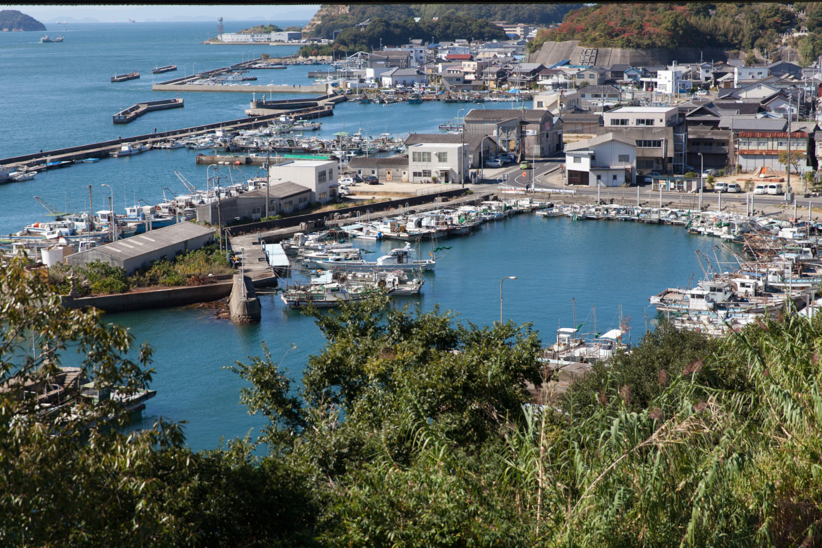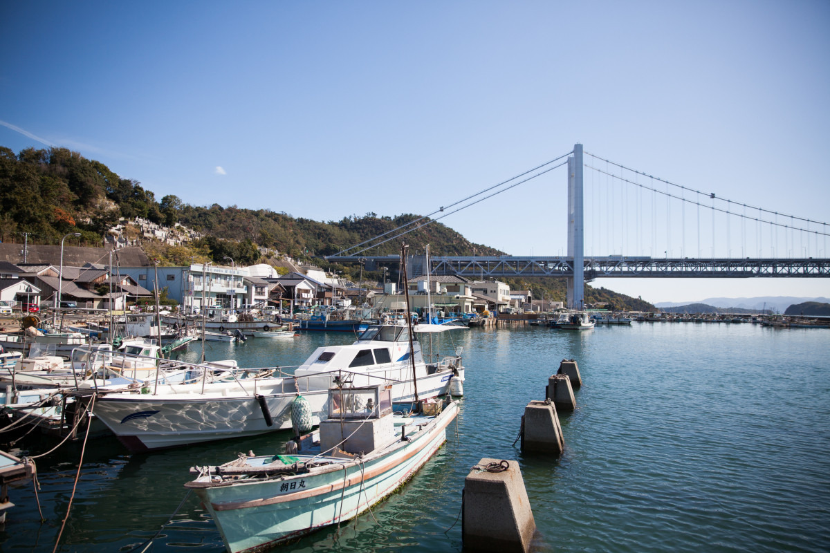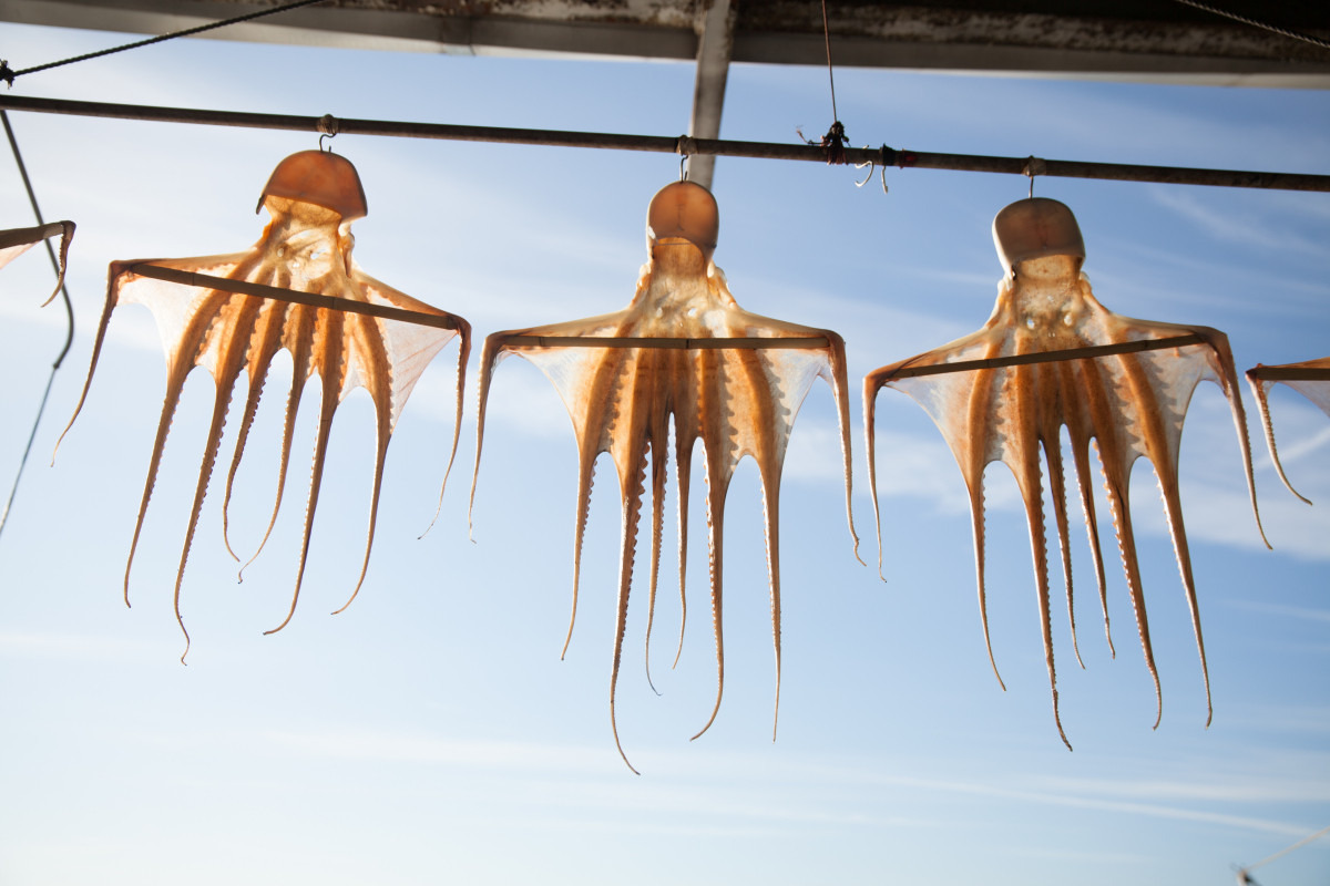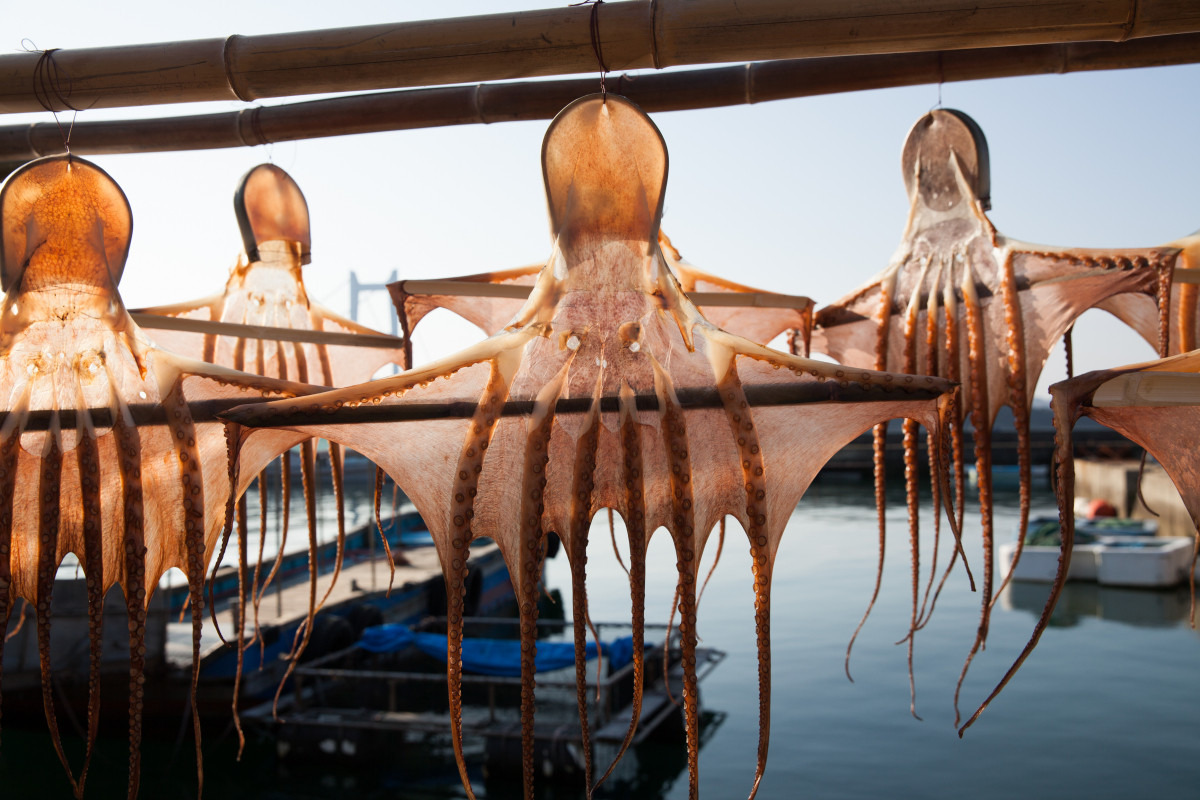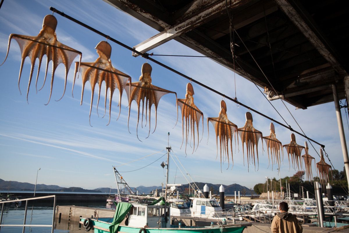 瀬戸大橋のたもとに連なる、下津井地区の3つの漁港では、大きなタコの足を広げて天日干しにする風景が冬の風物詩。そのひとつ、第一田之浦吹上漁協では、一本釣りによるタコ漁が行われています。